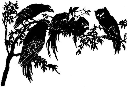 Then the Crow flew up into the air crying, "I don't[92] like it! I don't like it!" The Owl rose and followed him. From that time on the Crows and the Owls have been enemies. The birds chose a Turtle Dove to be their king, and then flew to their homes.