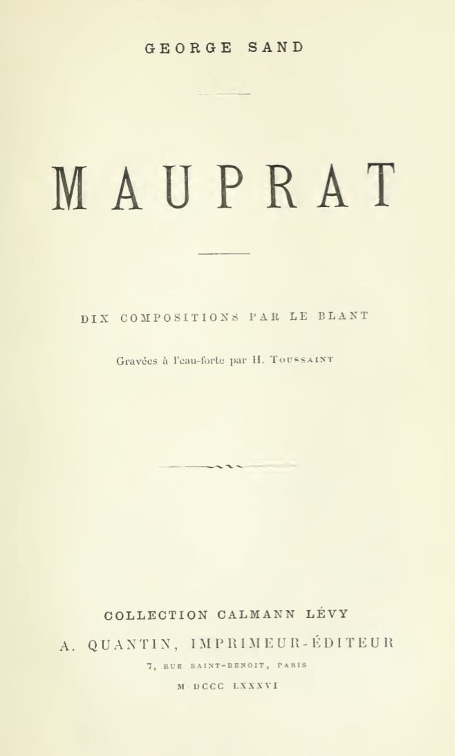 Quand j'écrivis le roman de Mauprat à Nohant, en 1846, je crois, je venais de plaider en séparation. Le mariage, dont, jusque-là, j'avais combattu les abus, laissant peut-être croire, faute d'avoir suffisamment développé ma pensée, que j'en méconnaissais l'essence, m'apparaissait précisément dans toute la beauté morale de son principe.