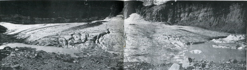 PANORAMIC VIEW OF GRINNELL GLACIER AS IT APPEARED IN 1945. THE CREVASSES IN GLACIER MAY BE OVER 50 FEET DEEP (BEATTY PHOTO)