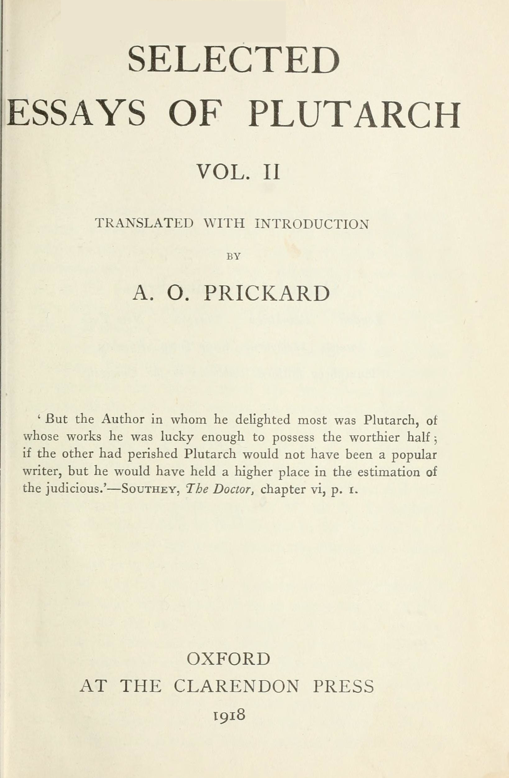 This volume covers about one-eighth part of the miscellaneous works of Plutarch known as the Moralia, much the same quantity as is contained in Professor Tucker’s volume of this series which appeared in 1913. All the pieces now offered are in the form of dialogue, except the short treatise On Superstition, which seemed to justify its inclusion by a certain affinity of thought.