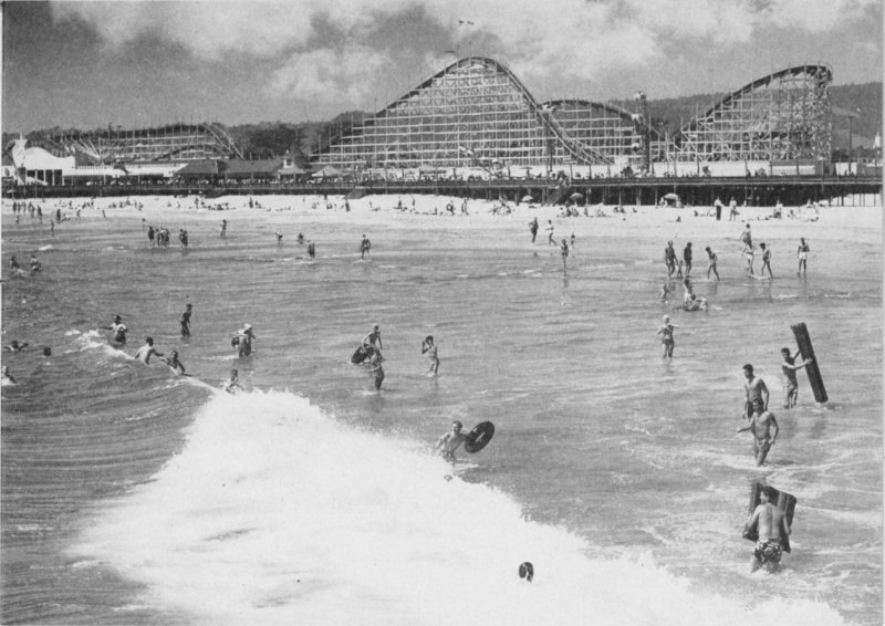 Even in the seventies, however, this was known as a resort region, where the nabobs from San Francisco came to take their ease and recuperate from the strains of their latest coups of high finance. It came into full stature with the building of its first beach casino in 1906. Though this promptly burned, it was as promptly replaced with the ornate structure the public sees today. This has been further improved and renovated in recent times, as has also the Coconut Grove dancing pavilion which is an outstanding beach feature. Beside the mile-long beach of white sand with its beautifully clear water there is an indoor salt-water plunge and a boardwalk which runs eastward to the San Lorenzo River. These, with a varied assortment of rides and concessions, drew 2,000,000 visitors last year and bid fair to excel that figure by a fifth this season.