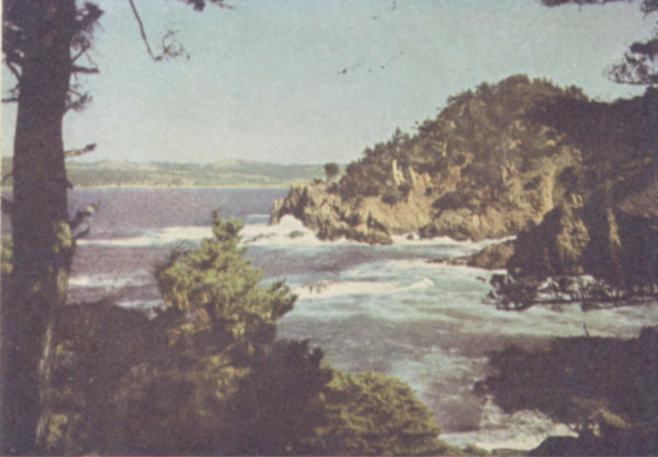 In the north is Santa Cruz, with its famous beach and lovely gardens, and backed by the Santa Cruz Mountains with their redwoods. Southward are historic old Monterey and Carmel, the art colony which has now become a Mecca for sight-seers and vacationists. South, again, extends a road between the mountains and the sea which is one of California’s scenic marvels.