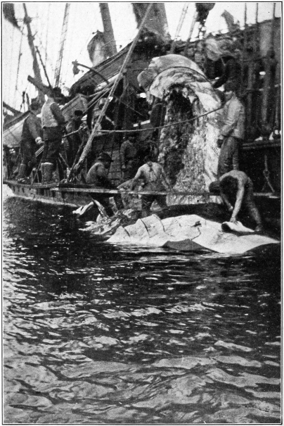 After the brig had been laid aback near the ice, a boat was lowered and a hole was cut in the bow of the whale's head. A cable was passed through this and the other end was made fast aboard the ship. Then under light sail, the brig set about the work of pulling the whale out of the ice. The light breeze fell away and the three boats were strung out ahead with hawsers [ 246 ] and lent assistance with the oars. It was slow work. But when the breeze freshened, the ice began gradually to give, then to open up, and finally the whale was hauled clear and drawn alongside for the cutting in.