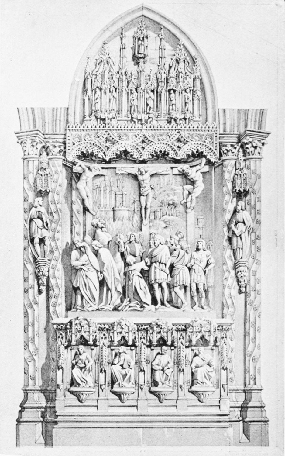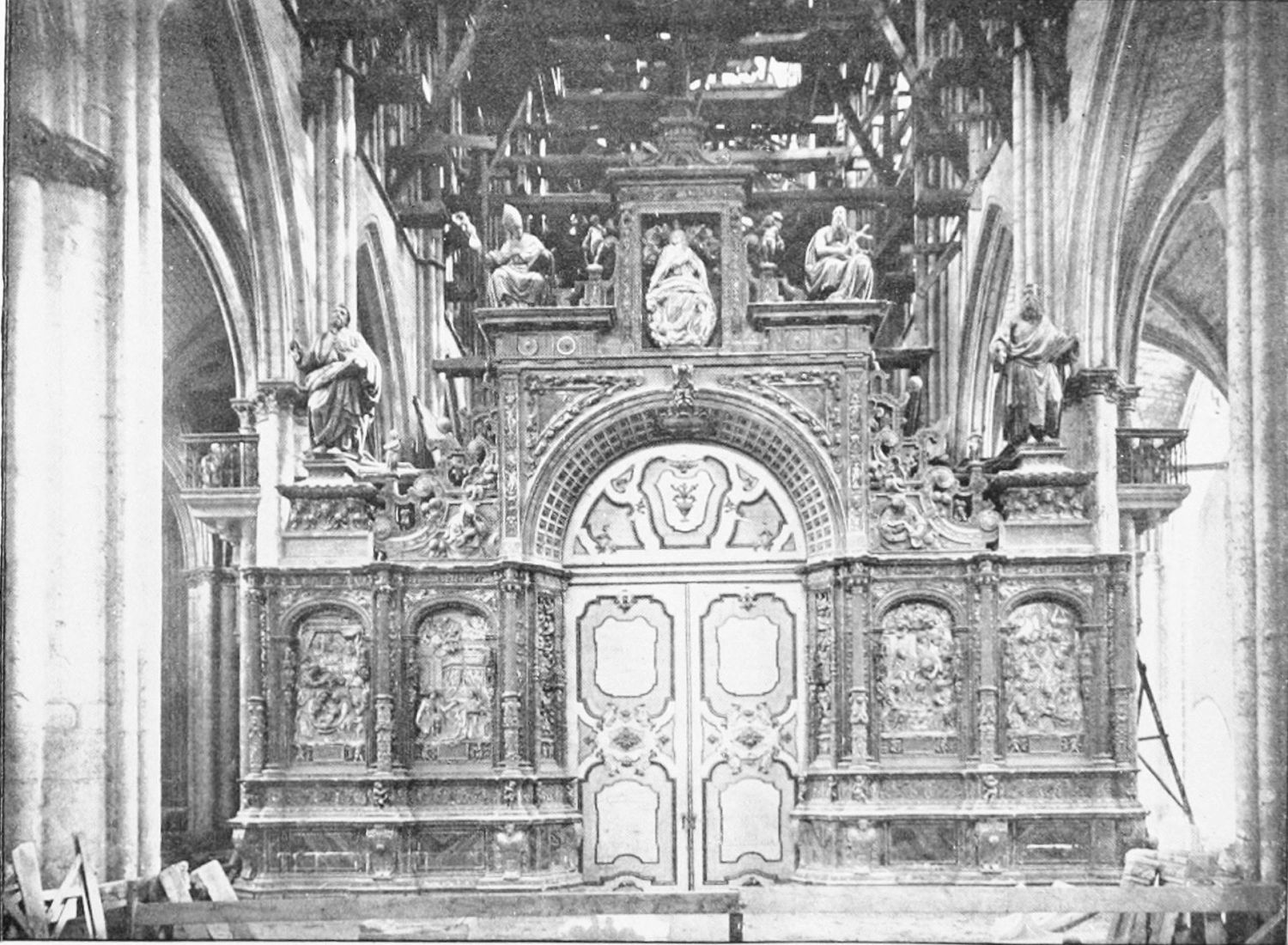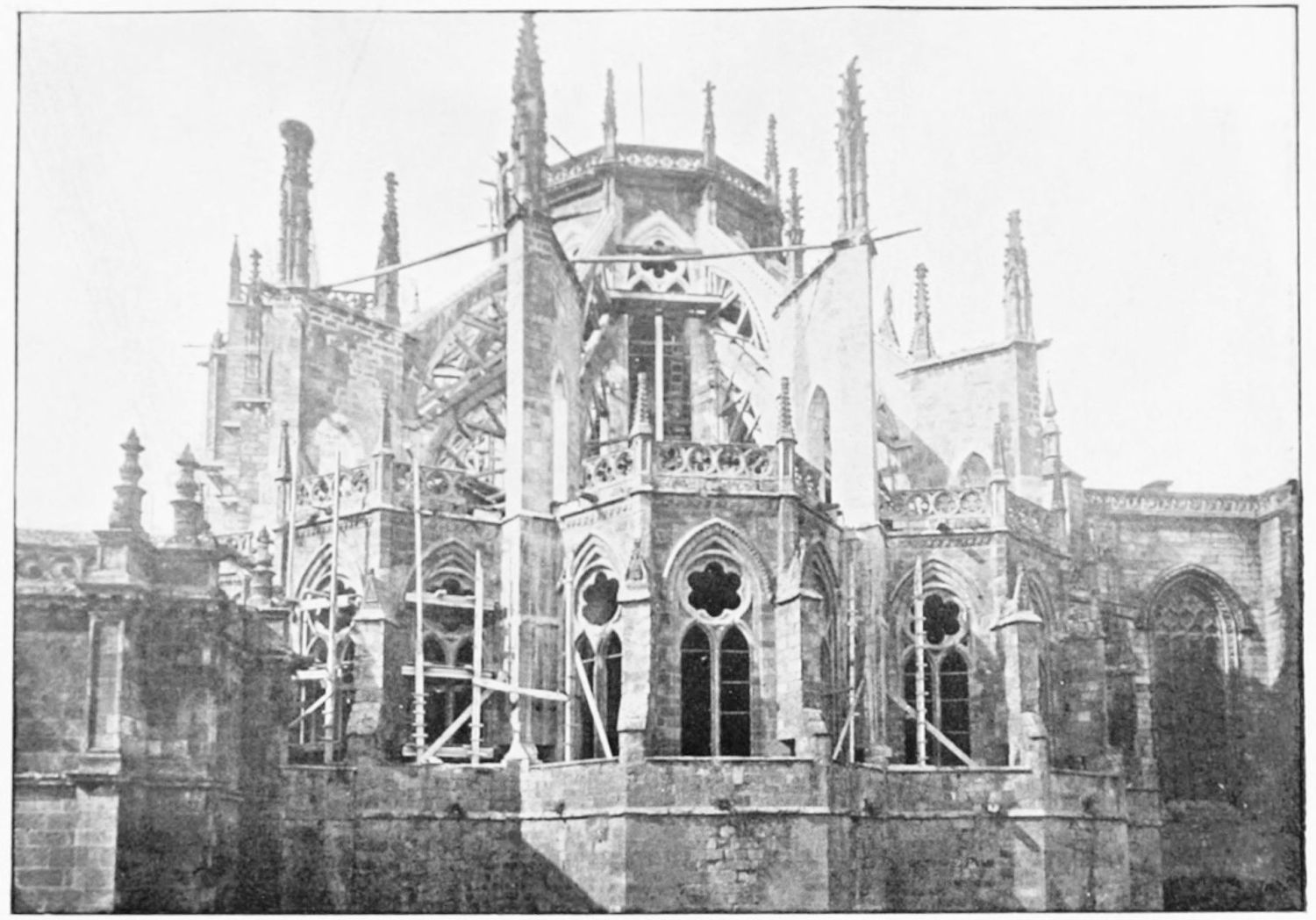 The beauty of this wonderful church consists largely in its lightness. Its supports are so slender, its walls so freely pierced with windows at every stage, its details everywhere so delicate, that the term ‘frozen music’ applied to architecture seems here indeed no mere hyperbole. ‘A mere lantern,’ Street calls the church, and blames the architect for his extreme daring and for his excessive use of windows. Though the vaults had been filled in with very light stone or concrete, the fabric was ever trembling on its fragile foundations. In 1631 the vault above the crossing collapsed, and was replaced by a dome. A hundred years later many of the arches of the aisles succumbed. Meanwhile Renaissance and Churrigueresque additions were made; but the whole was restored between the years 1850 and 1901, and now the cathedral exists in almost pristine symmetry and airiness.