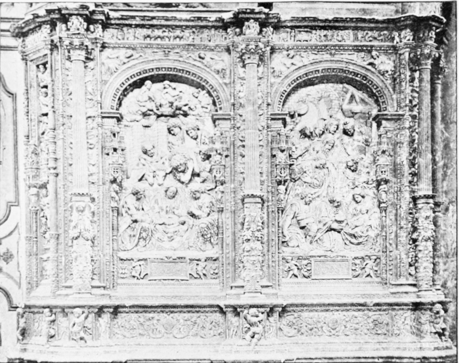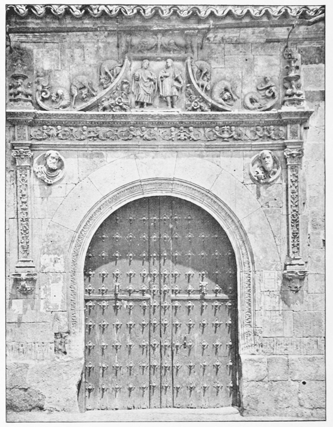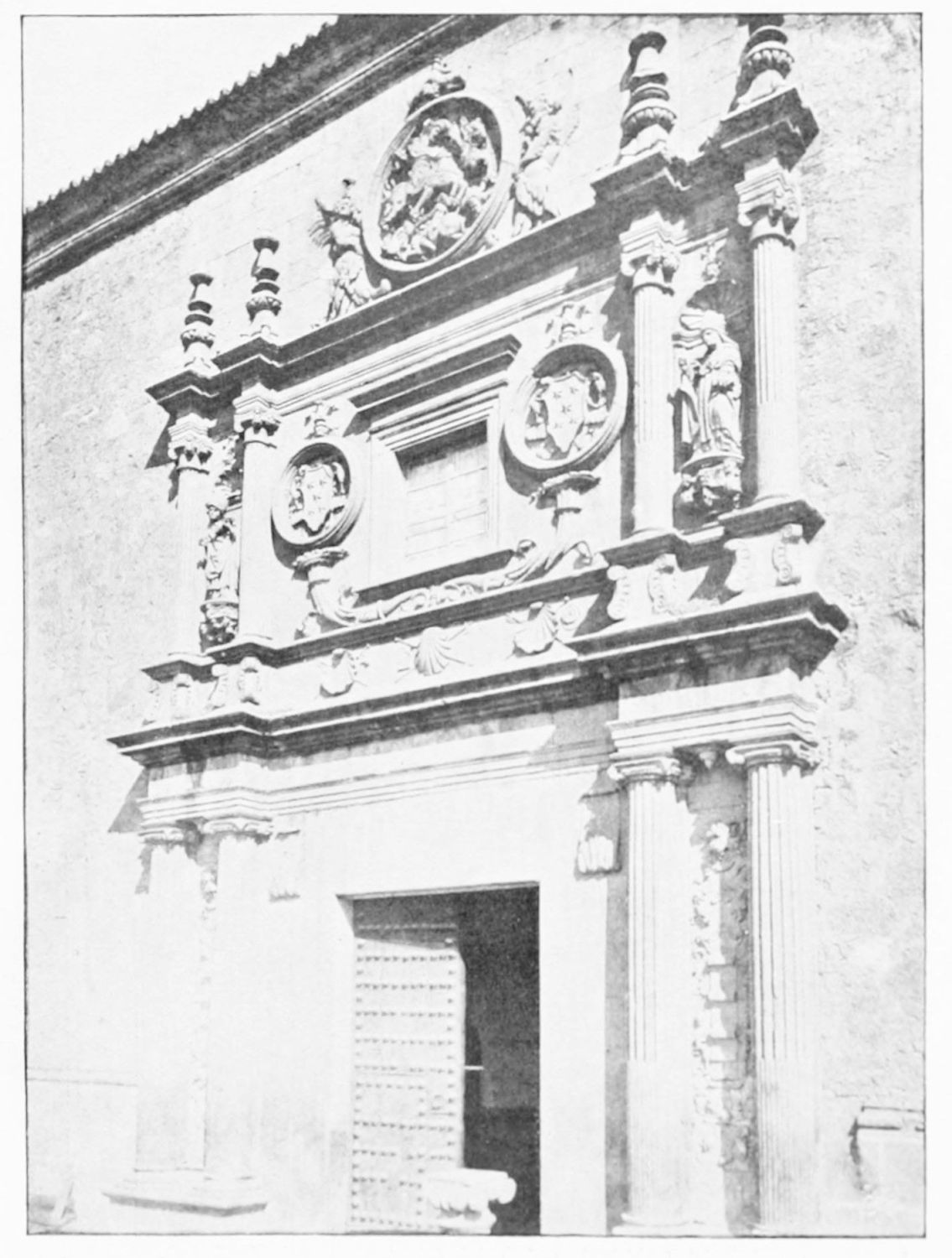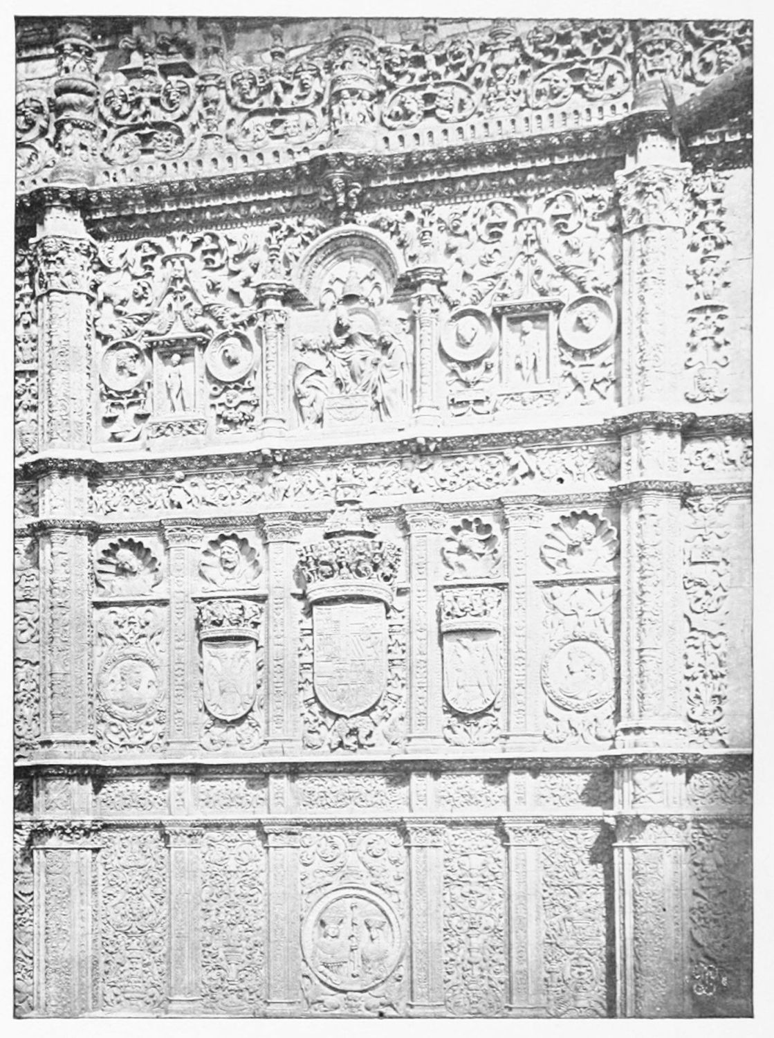 The Renaissance, which left everywhere in Spain so deep an impress, did not leave untouched this Gothic capital. Beside such triumphs of the Romanesque and pointed styles as San Isidoro and the pulchra Leonina rises the church of San Marcos, an interesting specimen of the newer school. Founded as a chapel of the new order of Santiago in 1170, the church witnessed the election of the first prior, and received in 1184 the ashes of the first grand master, Pedro Fernandez de Fuente Encalada. Fernando the Catholic ordered the church to be rebuilt in 1514,{26} but the work progressed very slowly and was not actually finished till 1715. The most important part of the fabric and the plans, however, we owe to Juan de Badajoz, who was working here about 1550. With the adjoining convent, first a hospice for pilgrims to Compostela, now the Provincial Museum, the building presents a very imposing appearance. The church occupies the eastern side of the block, the portal being contained within a very deep and lofty semicircular arch. On either side, in deep plateresque niches, are fine but damaged reliefs by Crozec. The ‘acroterium’ (to employ an expression used by Spanish writers), surmounting the arch, appears to be unfinished, as also are the towers or large buttresses flanking the portal.
