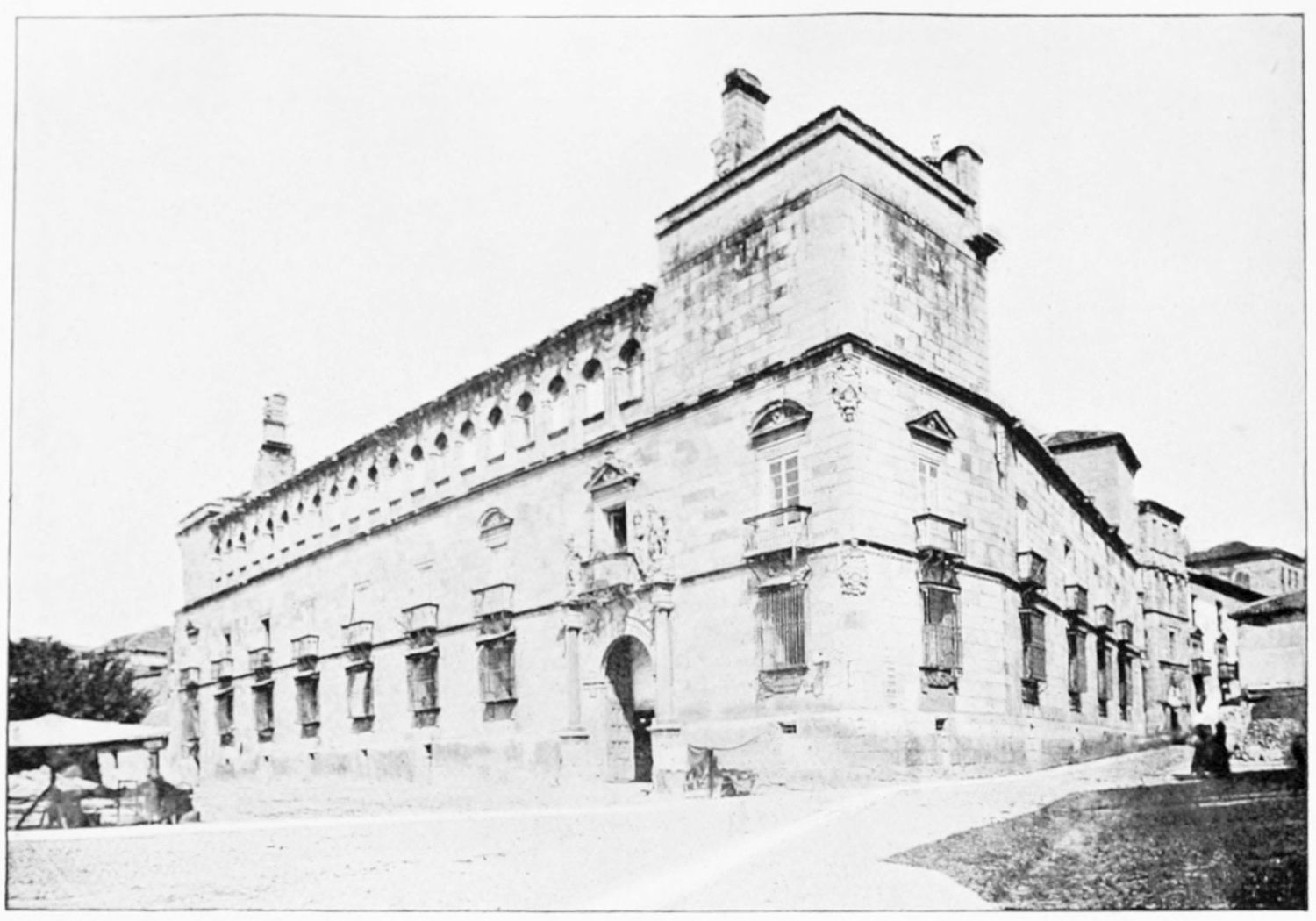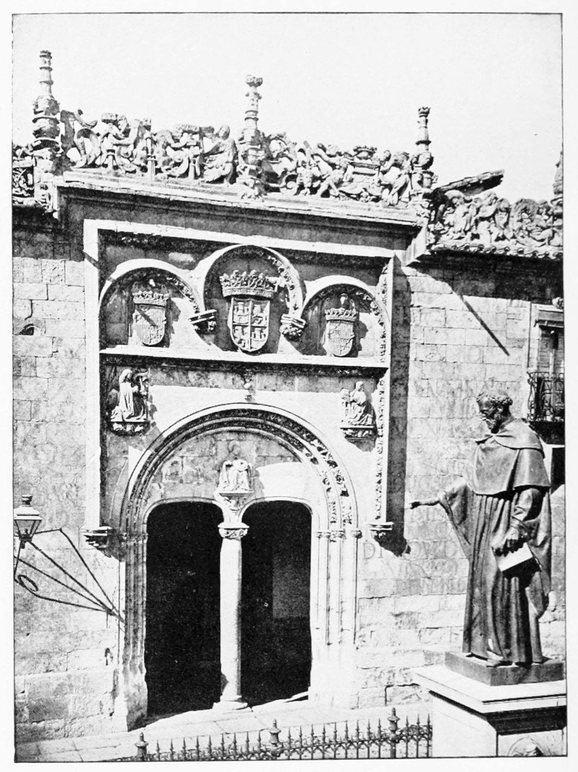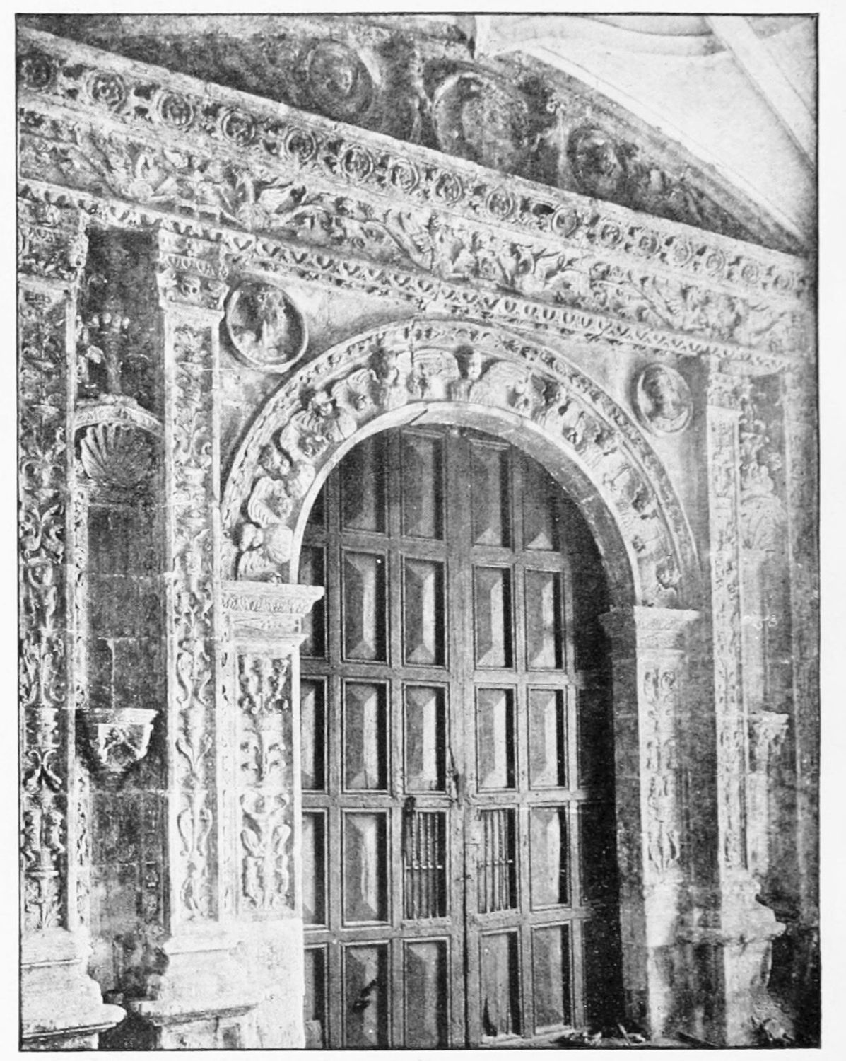 The Renaissance, which left everywhere in Spain so deep an impress, did not leave untouched this Gothic capital. Beside such triumphs of the Romanesque and pointed styles as San Isidoro and the pulchra Leonina rises the church of San Marcos, an interesting specimen of the newer school. Founded as a chapel of the new order of Santiago in 1170, the church witnessed the election of the first prior, and received in 1184 the ashes of the first grand master, Pedro Fernandez de Fuente Encalada. Fernando the Catholic ordered the church to be rebuilt in 1514,{26} but the work progressed very slowly and was not actually finished till 1715. The most important part of the fabric and the plans, however, we owe to Juan de Badajoz, who was working here about 1550. With the adjoining convent, first a hospice for pilgrims to Compostela, now the Provincial Museum, the building presents a very imposing appearance. The church occupies the eastern side of the block, the portal being contained within a very deep and lofty semicircular arch. On either side, in deep plateresque niches, are fine but damaged reliefs by Crozec. The ‘acroterium’ (to employ an expression used by Spanish writers), surmounting the arch, appears to be unfinished, as also are the towers or large buttresses flanking the portal.