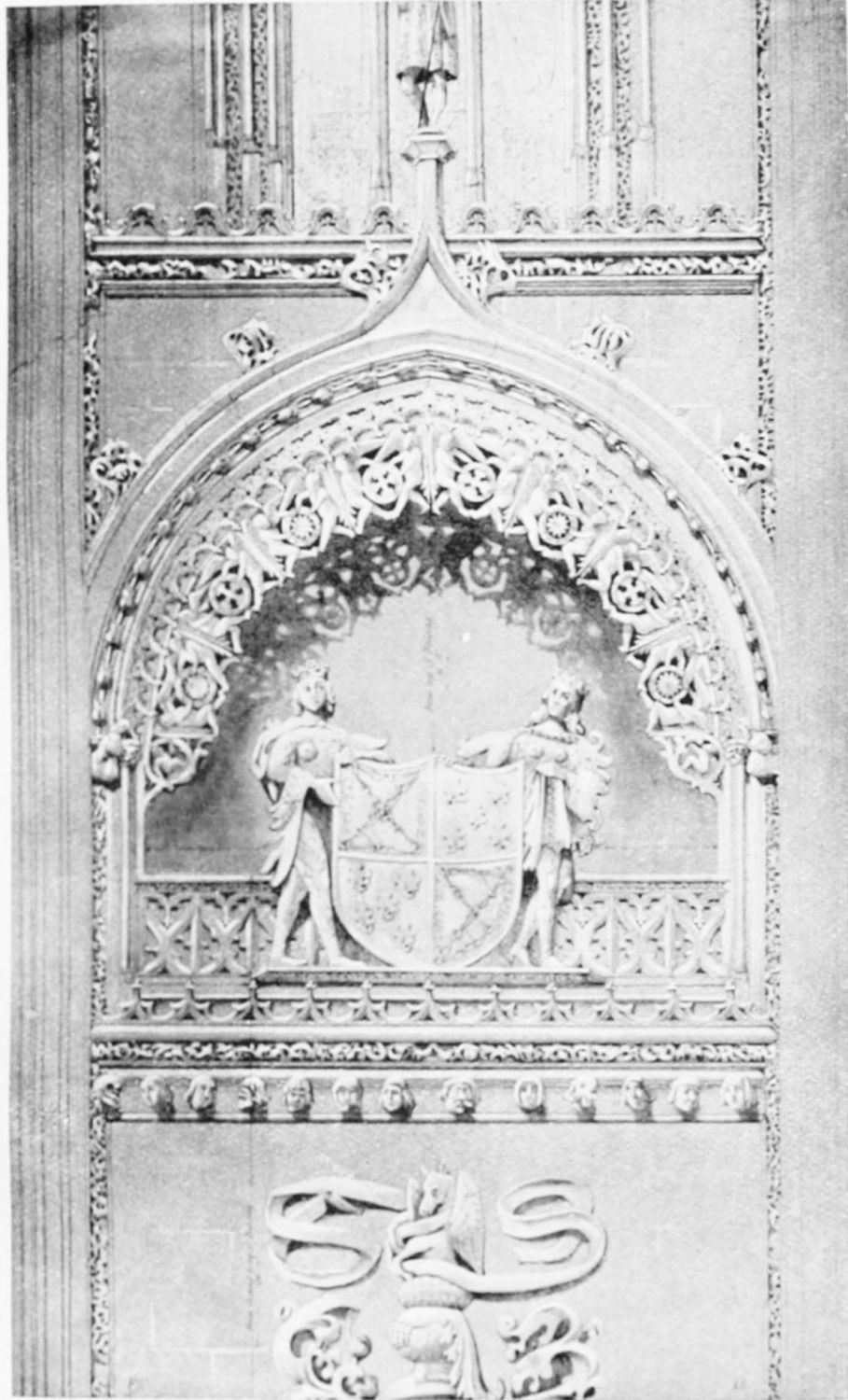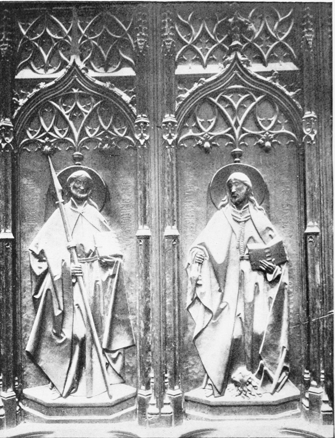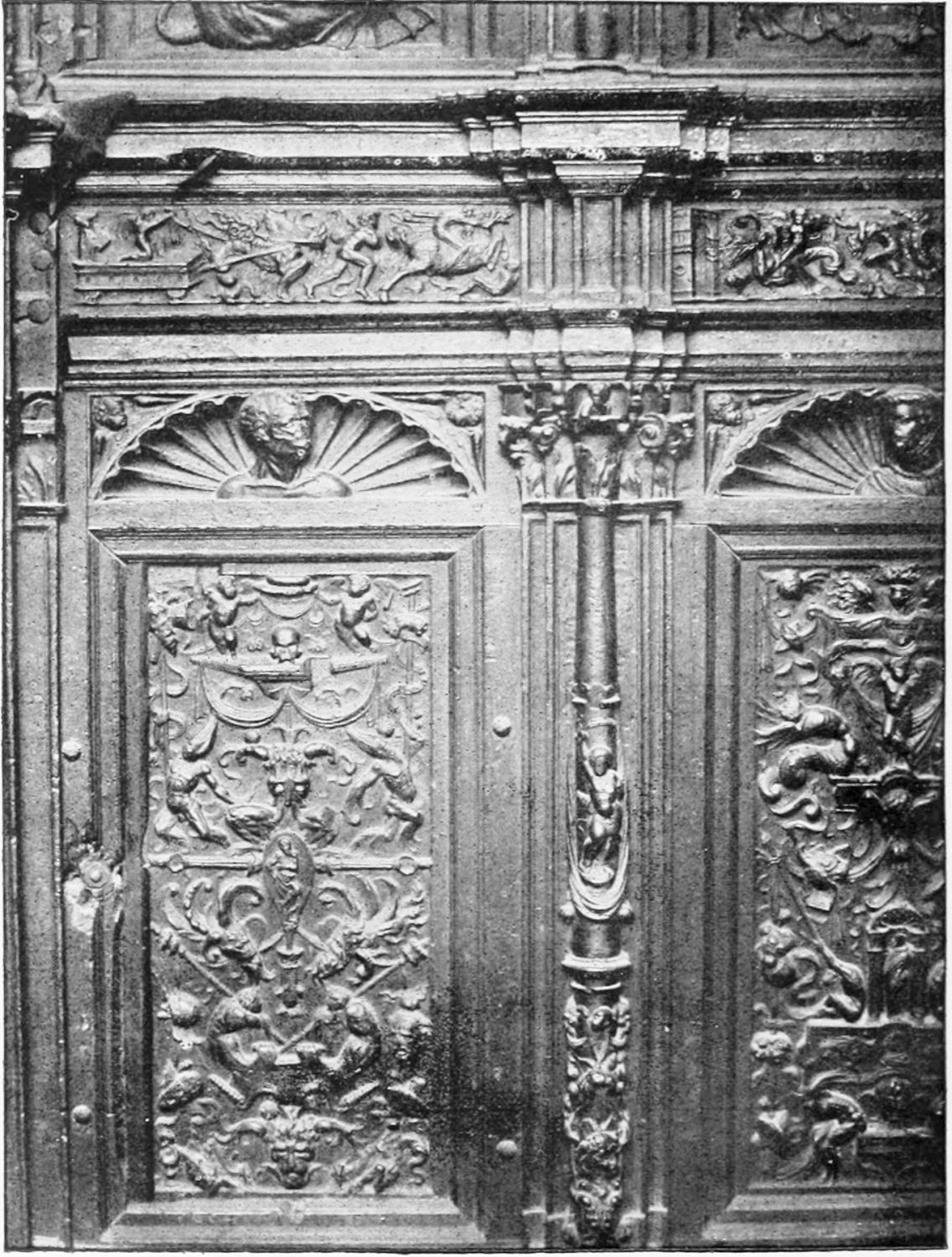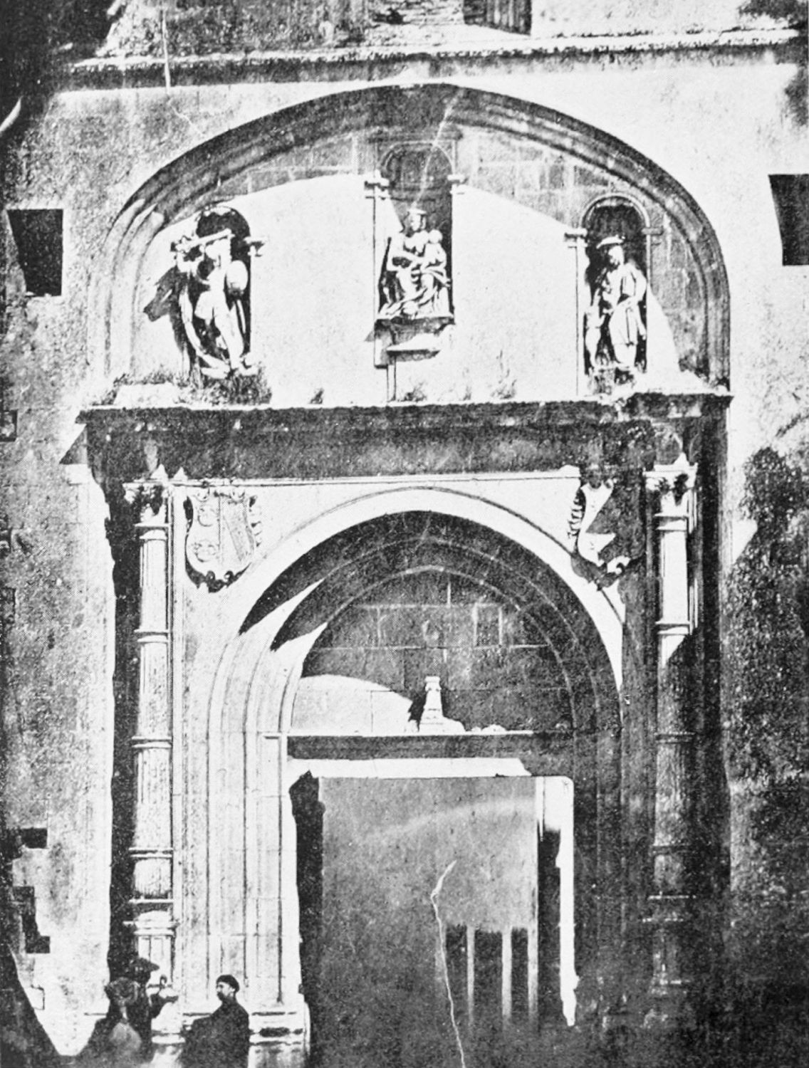 The Renaissance, which left everywhere in Spain so deep an impress, did not leave untouched this Gothic capital. Beside such triumphs of the Romanesque and pointed styles as San Isidoro and the pulchra Leonina rises the church of San Marcos, an interesting specimen of the newer school. Founded as a chapel of the new order of Santiago in 1170, the church witnessed the election of the first prior, and received in 1184 the ashes of the first grand master, Pedro Fernandez de Fuente Encalada. Fernando the Catholic ordered the church to be rebuilt in 1514,{26} but the work progressed very slowly and was not actually finished till 1715. The most important part of the fabric and the plans, however, we owe to Juan de Badajoz, who was working here about 1550. With the adjoining convent, first a hospice for pilgrims to Compostela, now the Provincial Museum, the building presents a very imposing appearance. The church occupies the eastern side of the block, the portal being contained within a very deep and lofty semicircular arch. On either side, in deep plateresque niches, are fine but damaged reliefs by Crozec. The ‘acroterium’ (to employ an expression used by Spanish writers), surmounting the arch, appears to be unfinished, as also are the towers or large buttresses flanking the portal.