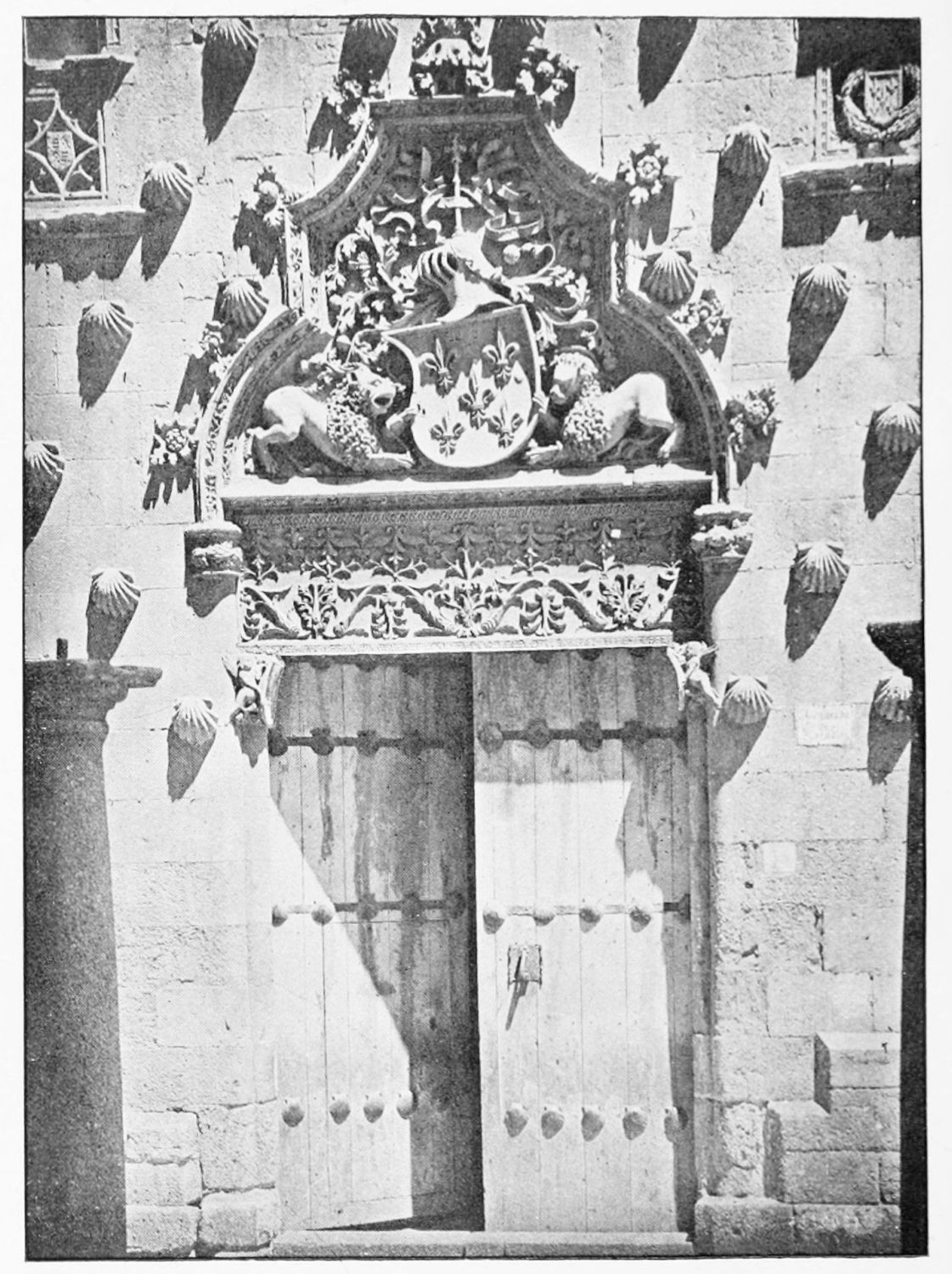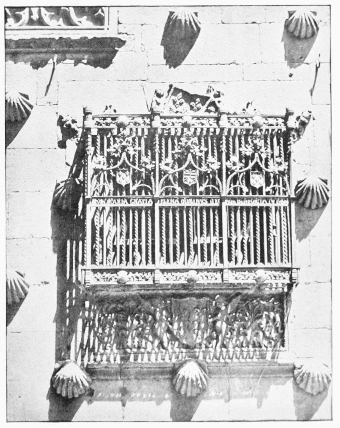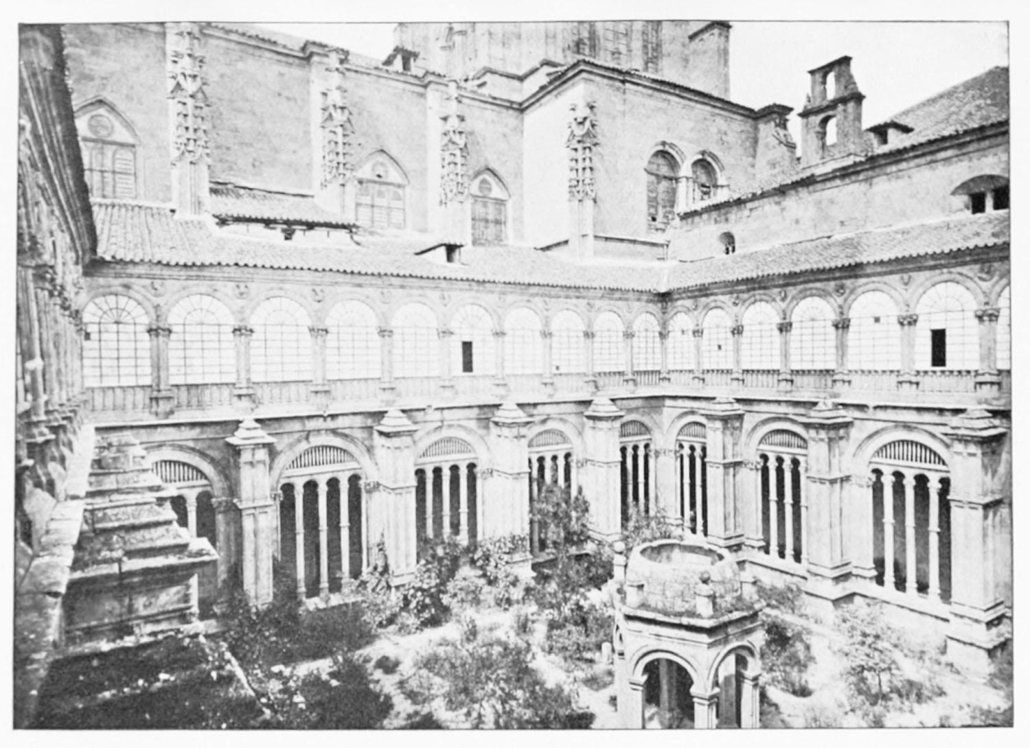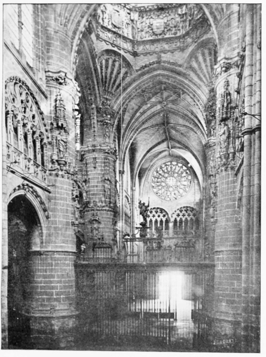 At the north-eastern shoulder of the church, between it and the tower in the city wall already mentioned, is the fine rectangular chapel of Santiago, built in the time of the Catholic sovereigns—on the site, it would seem, of a{23} twelfth-century chapel. The pillars are borne on the shoulders of various figures, among them being Samson, the Queen of Sheba, Laocoon, and a monk with a book on which is the derisive motto legere et non intelligere. The details of the architecture are capricious and graceful. The chapel is lighted by colossal windows, filled with gorgeous stained glass—blue and gold, purple and emerald—the reflected colour producing a magical effect.