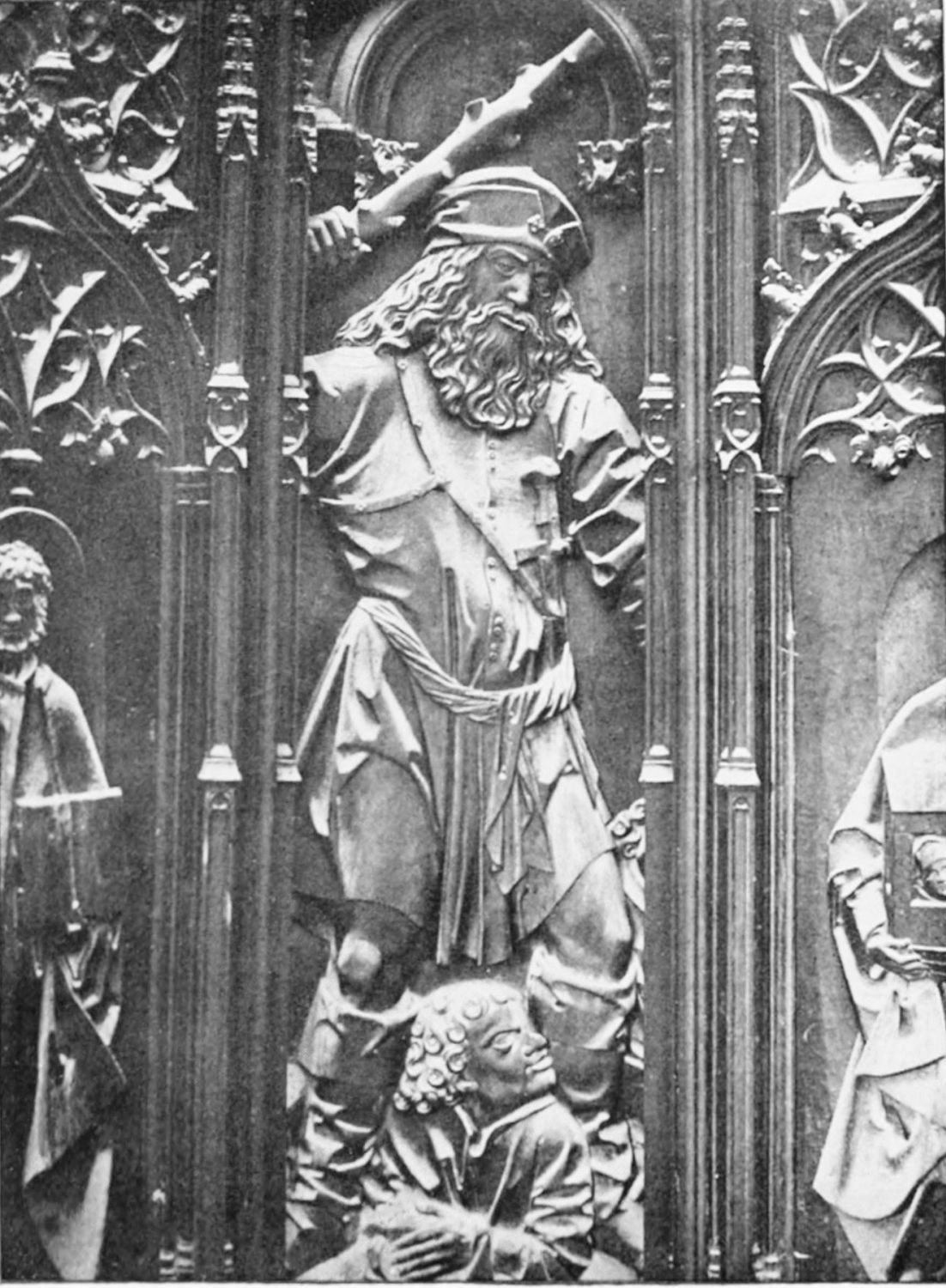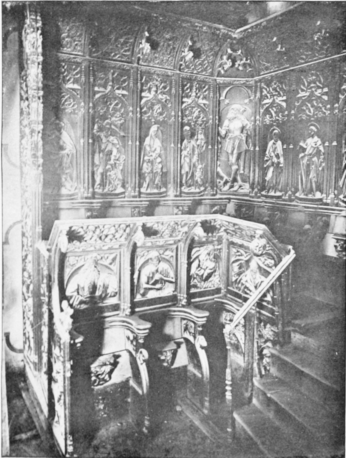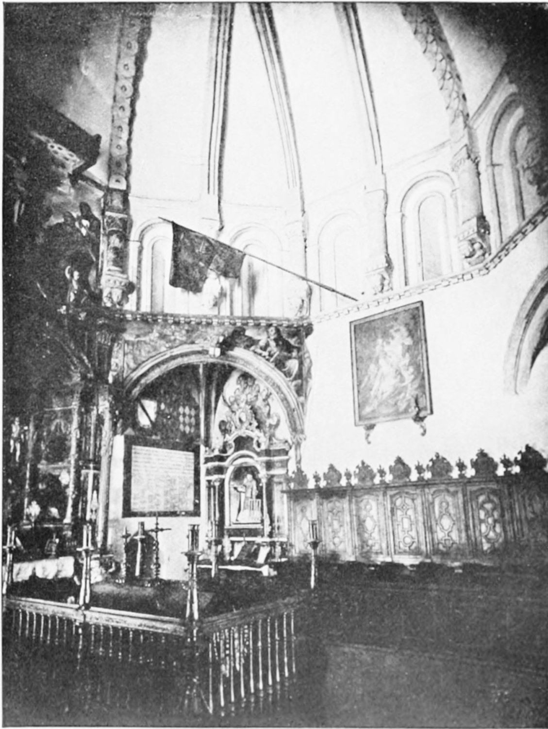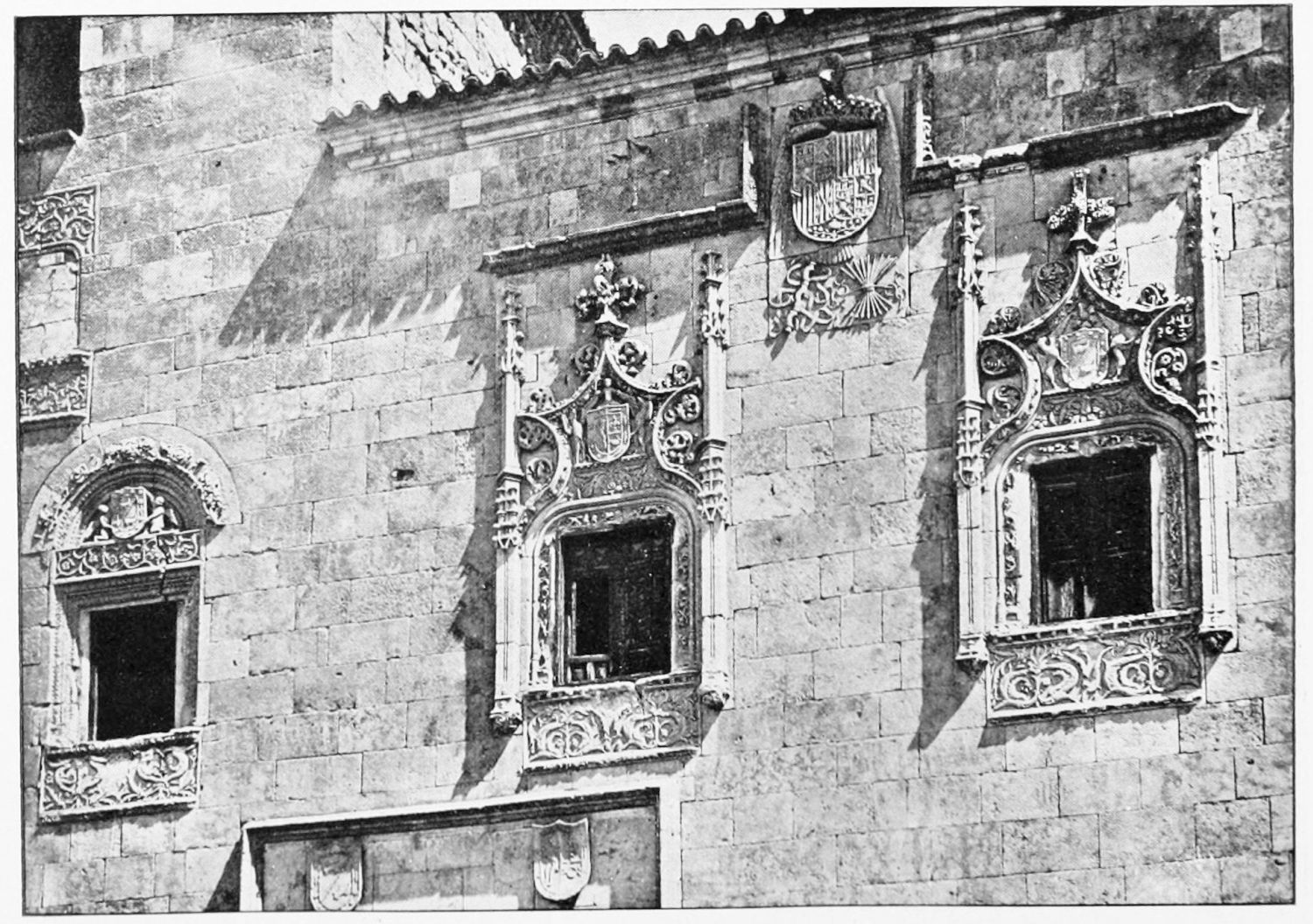At the north-eastern shoulder of the church, between it and the tower in the city wall already mentioned, is the fine rectangular chapel of Santiago, built in the time of the Catholic sovereigns—on the site, it would seem, of a{23} twelfth-century chapel. The pillars are borne on the shoulders of various figures, among them being Samson, the Queen of Sheba, Laocoon, and a monk with a book on which is the derisive motto legere et non intelligere. The details of the architecture are capricious and graceful. The chapel is lighted by colossal windows, filled with gorgeous stained glass—blue and gold, purple and emerald—the reflected colour producing a magical effect.