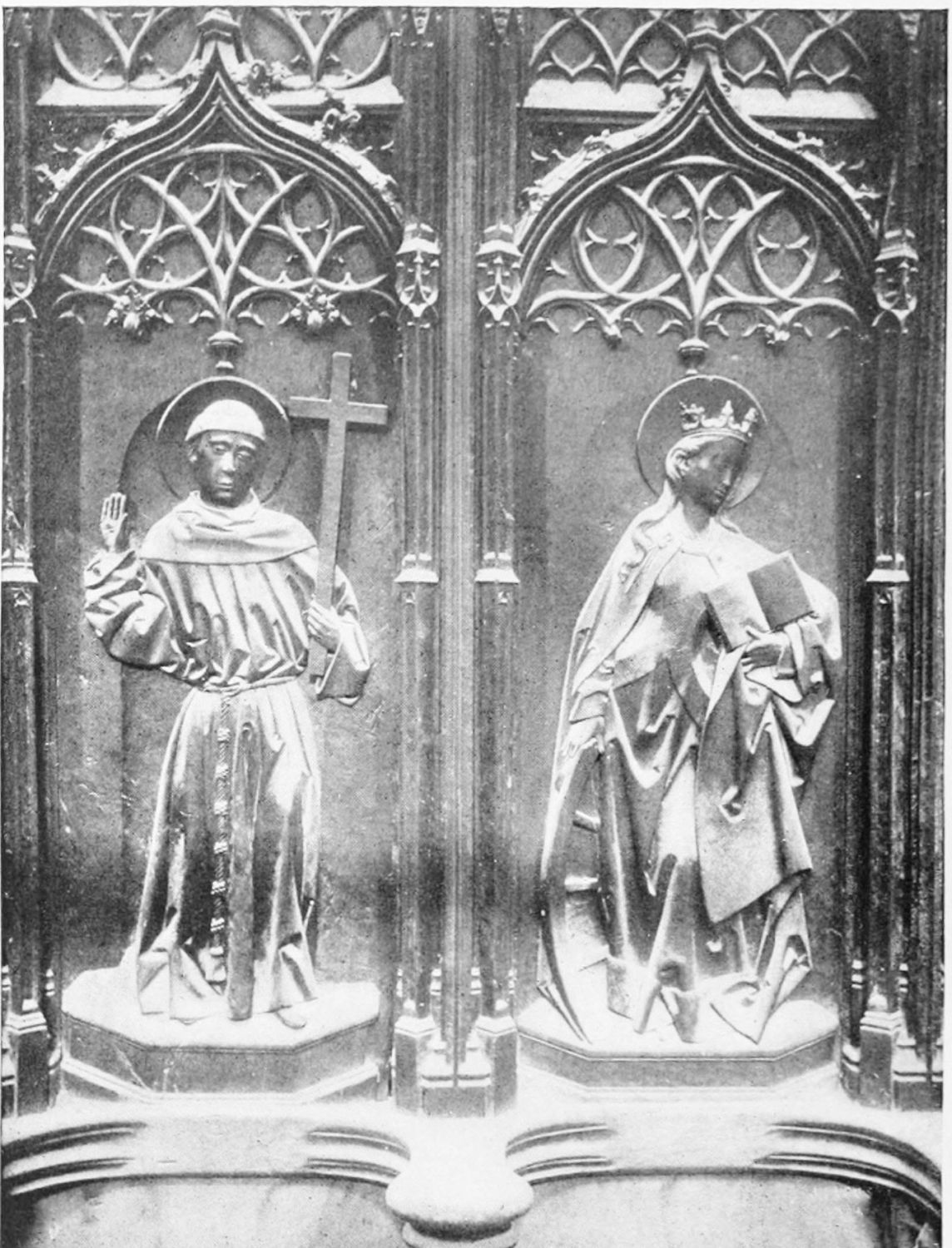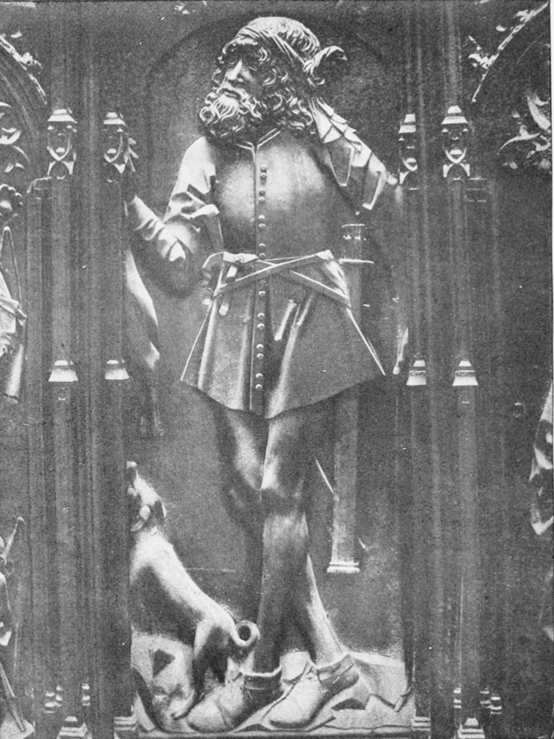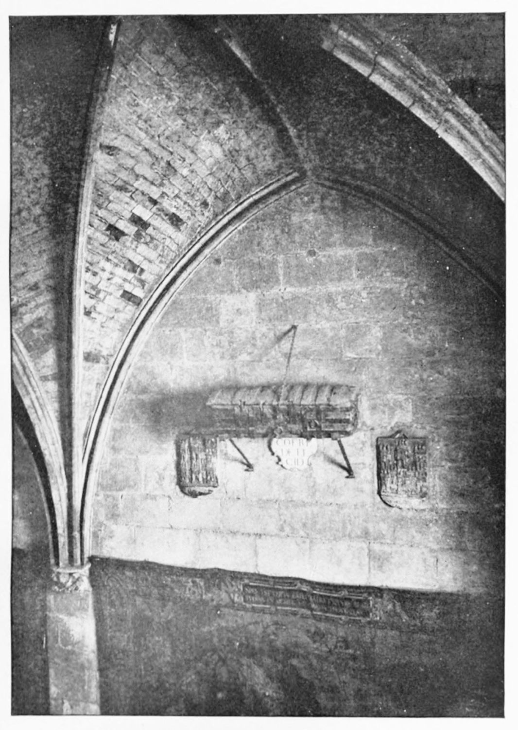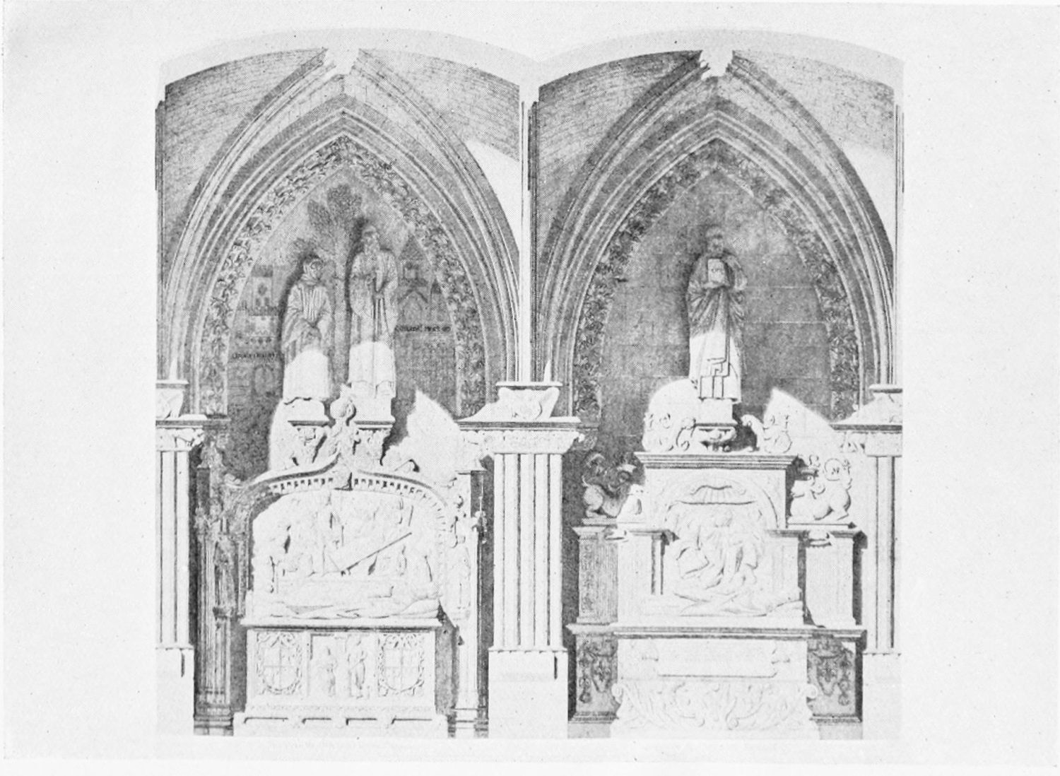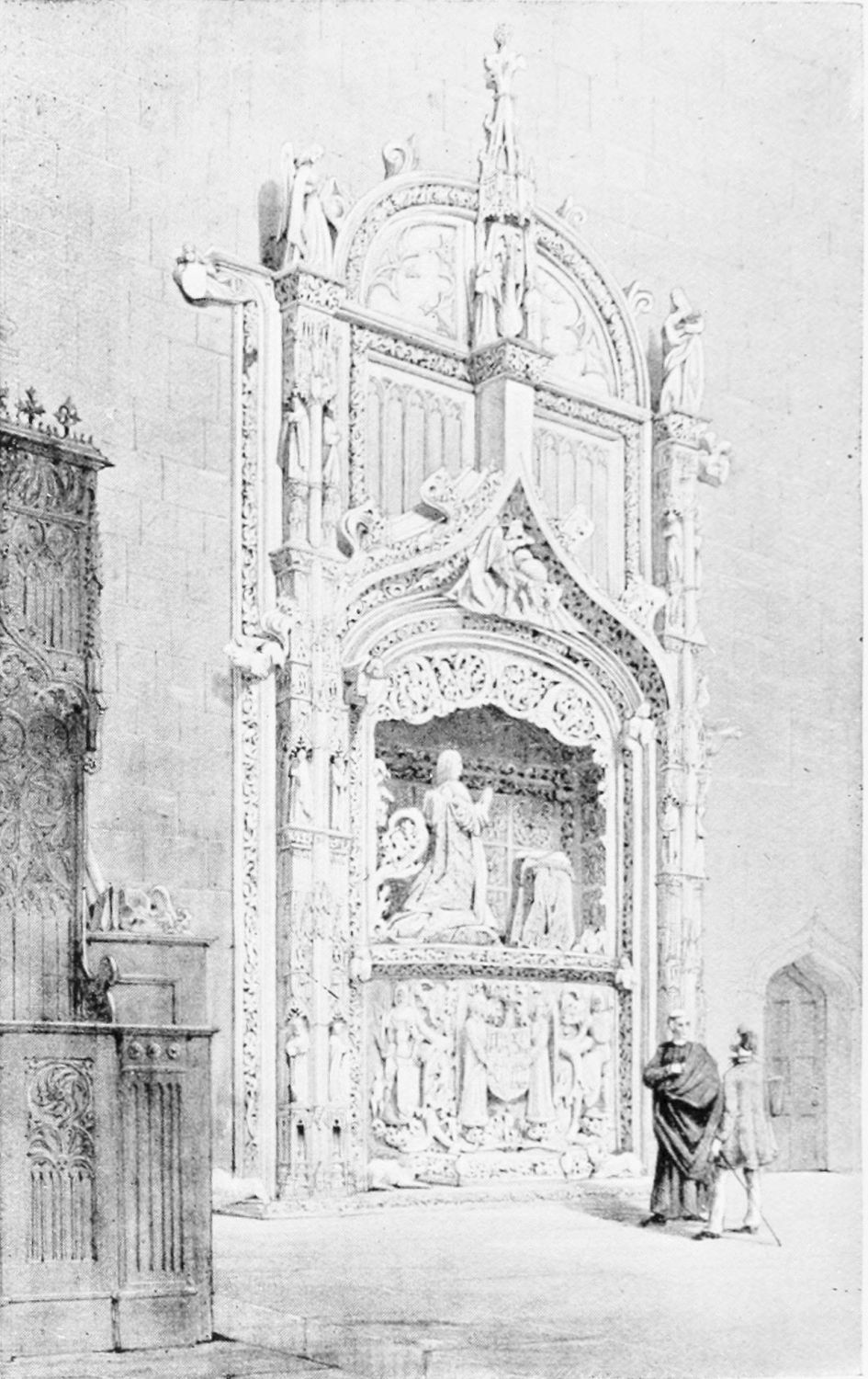But after the general ensemble and the stained glass, nothing in the cathedral merits as much attention as the tombs and monuments. Of these the noblest is the cenotaph of Ordoño II. at the rear of the High Altar, erected five centuries after his death as a tribute of gratitude by the citizens of Leon. Though in the florid Gothic style of the fifteenth century, many of the figures and inscriptions appear to have been copied from an earlier tomb. The recumbent effigy of the{21} king is large and dignified; his face is sharp and smooth-shaven; he wears his crown and the royal robes, and carries the orb and sceptre. At his feet lies a dog, the emblem of fidelity, beneath which is an inscription in Latin setting forth his deeds and virtues, and erroneously attributing to him the erection of the present temple. The monumental arch above encloses sculpture painted in brilliant colours on a gilt ground, which appears to be of an earlier elate than the rest of the monument. The arches of the wall of the Capilla Mayor have been bricked up, and those on each side of this monument are adorned with two very ancient distemper paintings of the Ecce Homo and Entombment. They exhibit some interesting peculiarities of dress and detail, and though the central figure is badly done, the spectators are lifelike and vigorously represented.