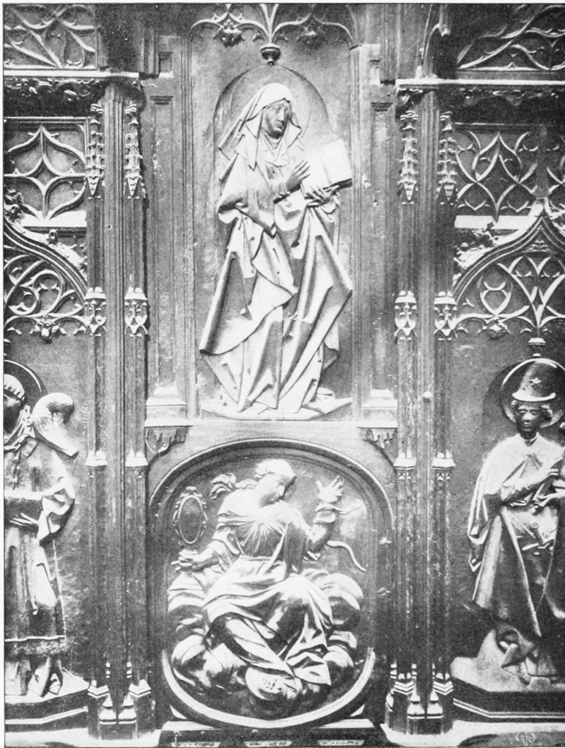 The church is large and cruciform, with some good glass, windows with plateresque traceries, and fine arabesques. The most notable accessories are the choir stalls, the upper row exhibiting admirably carved busts of New Testament worthies; the lower row, of the saints of the Old Dispensation. Grotesque and capricious masks, centaurs, griffins, and so forth, are introduced in great profusion into the decoration; they were the work, for the most part, of one Doncel in 1542, and were mutilated by a pupil of Churri{27}guera in the early part of the eighteenth century.