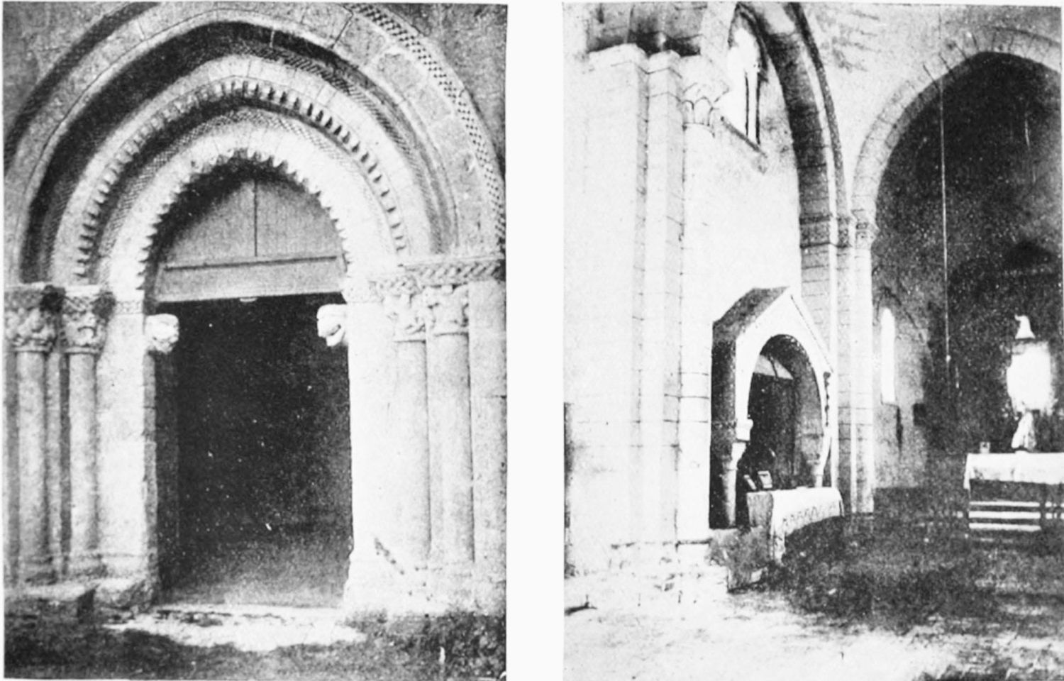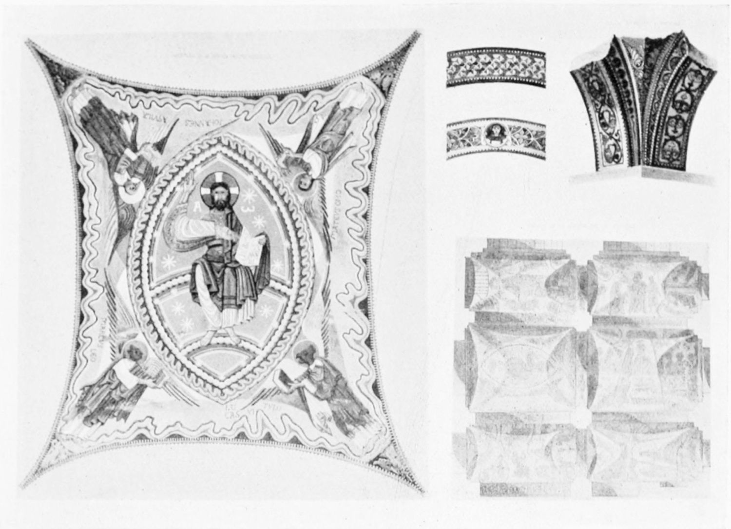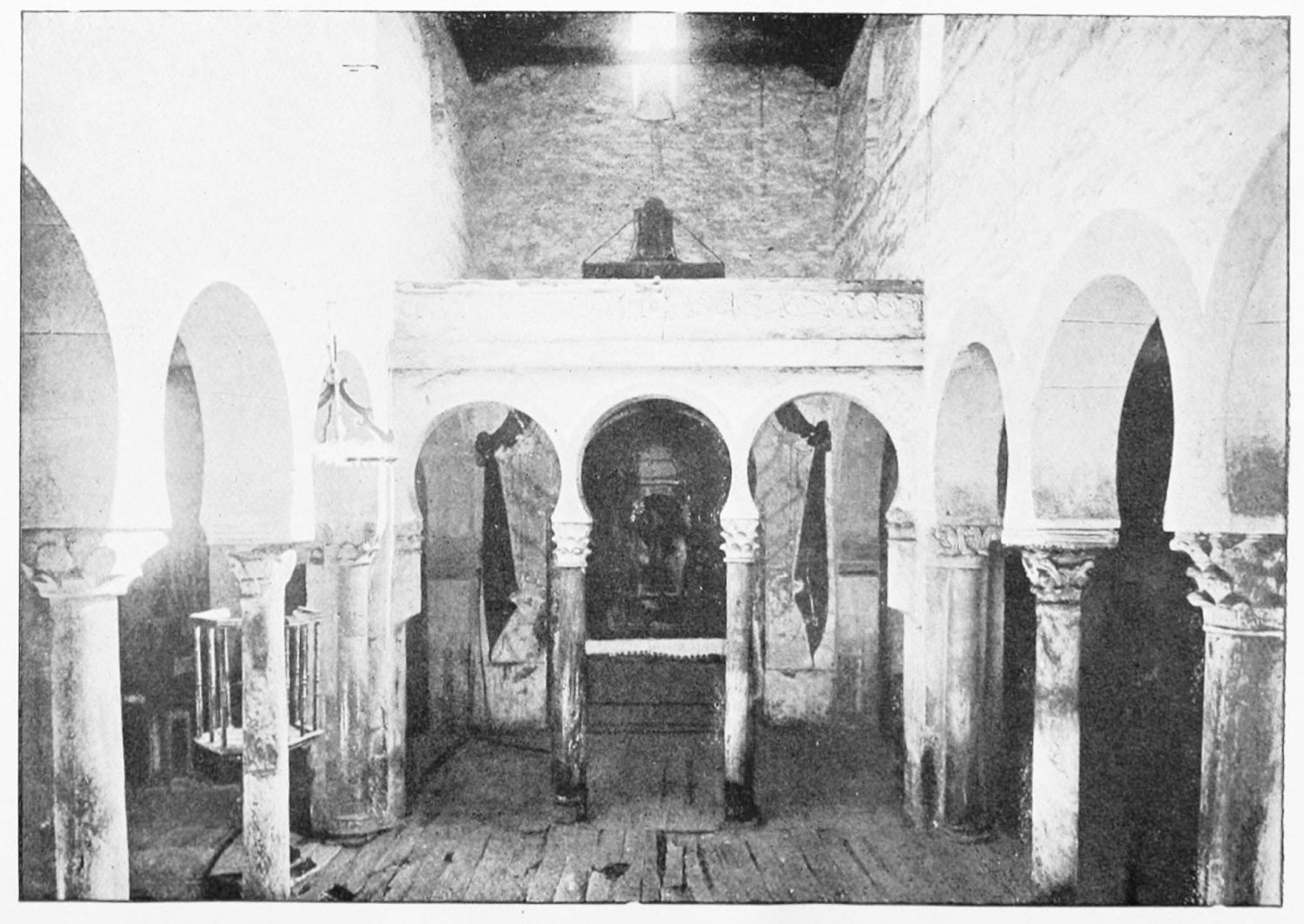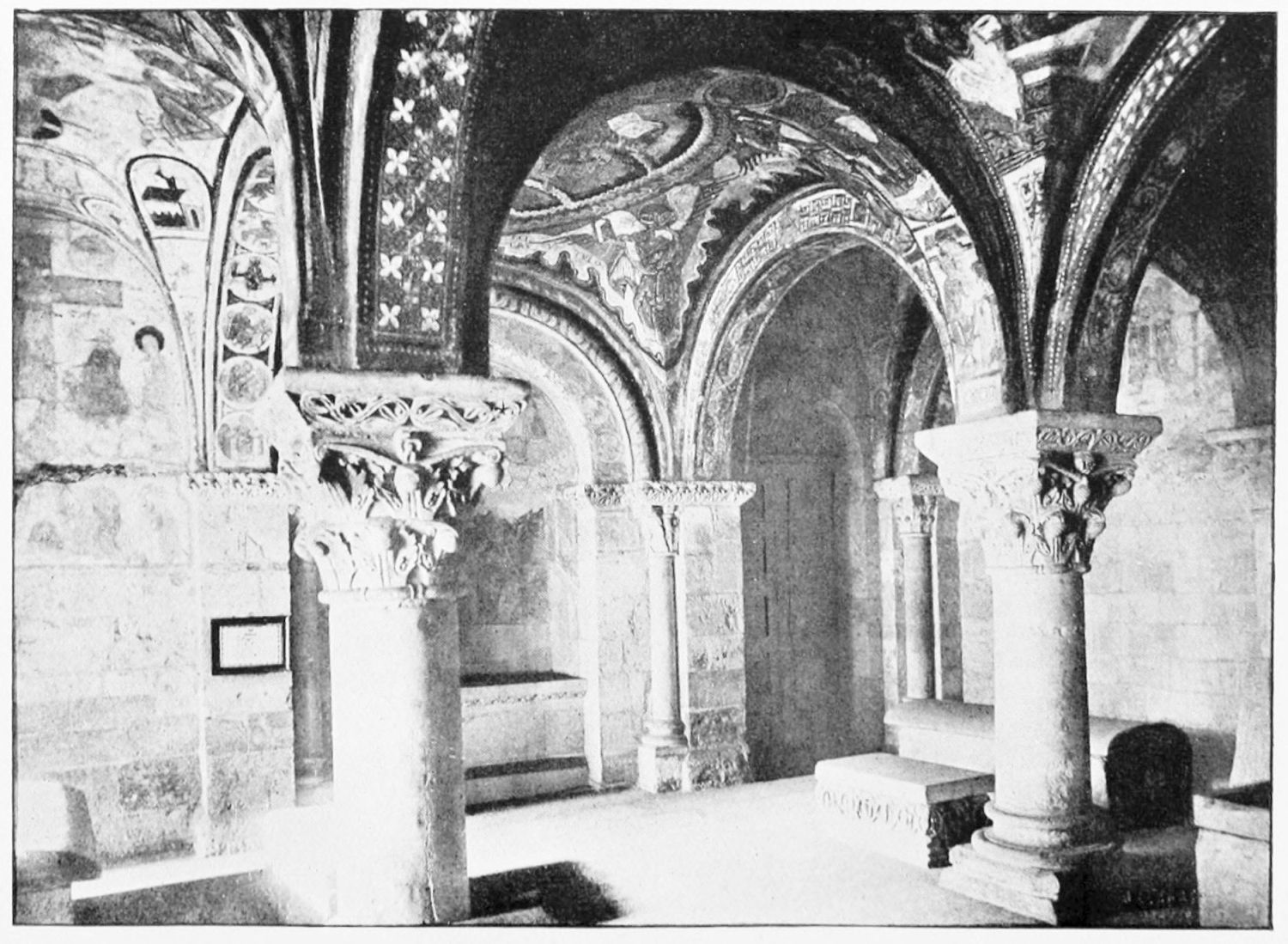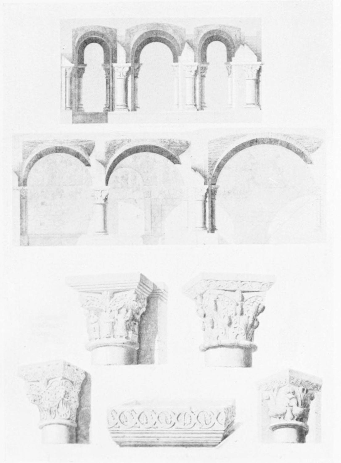 Leaving this place consecrated to wrath and tears, we re-enter the church. The plan is roughly cruciform, an apsidal chapel projecting to the east of each arm of the transept, on either side of the Capilla Mayor. We are now in that part of the fabric which was built by order of Alfonso VII., evidently on the model of St. Sernin at Toulouse. The name of the architect is given on an inscription in the flooring as Petrus de Deo—Peter of God. The most interesting features in the church are the very ancient mural paintings in the Byzantine style, with the same profusion of foliage and richly moulded capitals to be noticed in the Pantheon. The dentated and horse-shoe arches reveal traces of Moorish influence, showing that even in the far north of Spain architects could not have closed their eyes and ears altogether to the doings of the detested infidels.