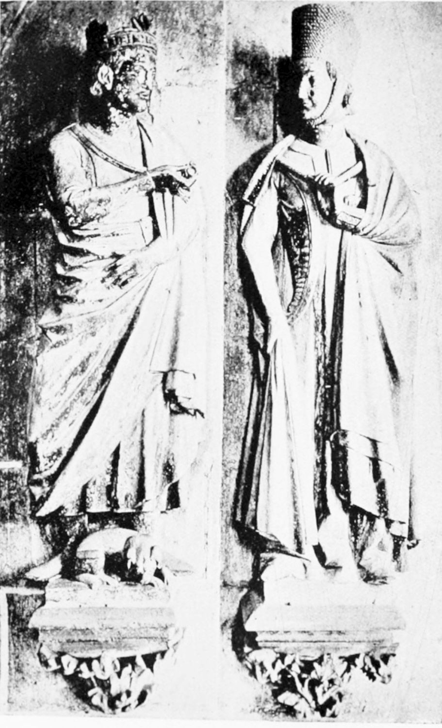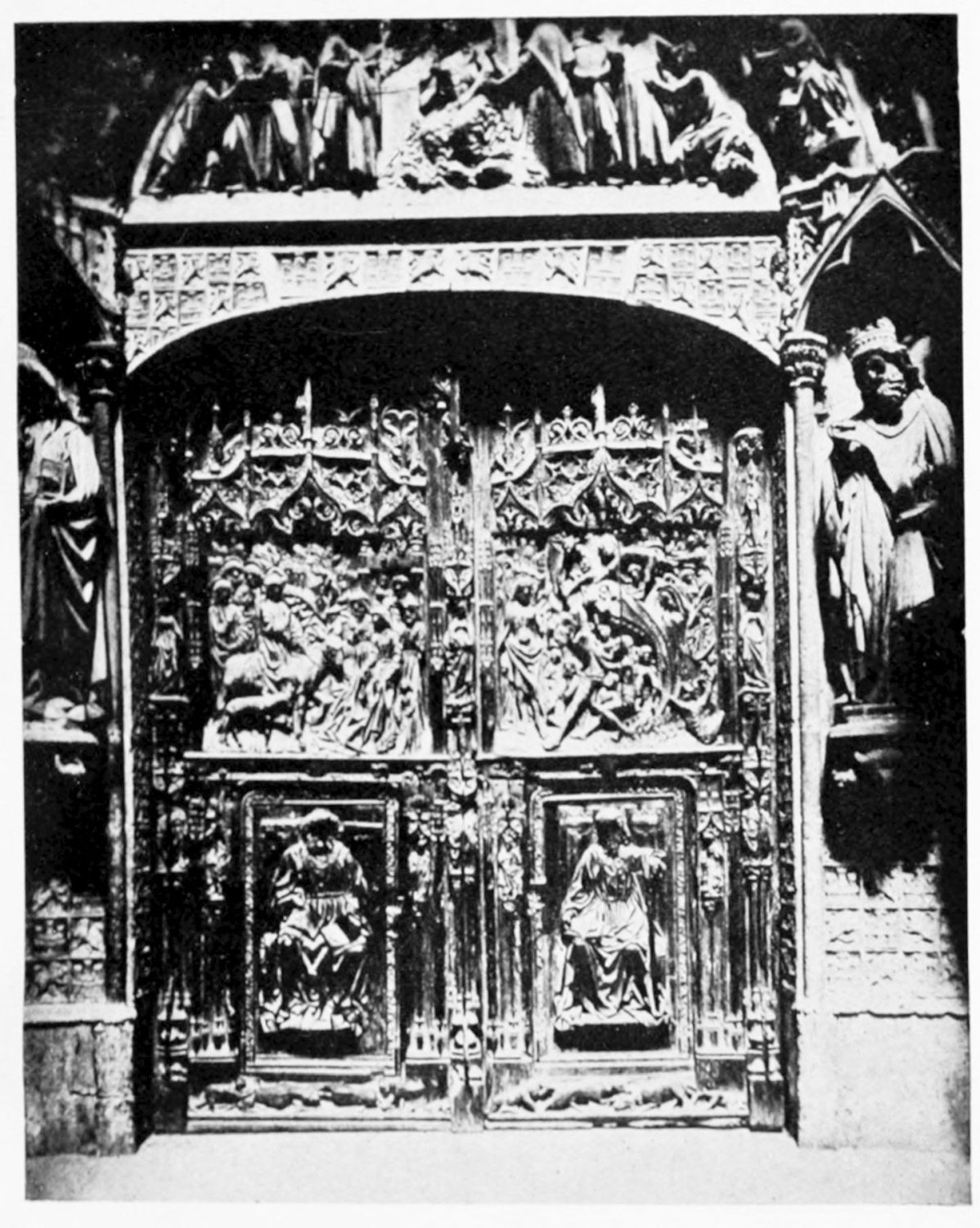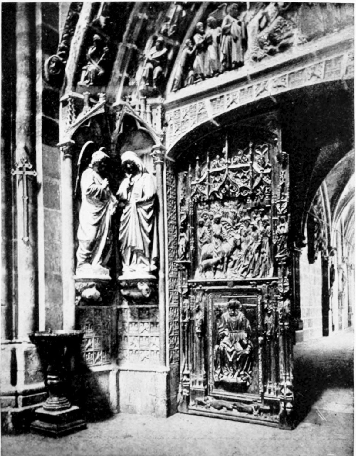 The façade between these steeples is very beautiful. It is surmounted by a pediment with ‘acroteria’ or pedestals to receive statues. Beneath this is a very large wheel-window above a row of windows corresponding to the triforium. The three magnificently sculptured doorways extend from steeple to steeple. The arches are pointed and triple. Byzantine influence is visible in the statuary and foliage. The figures, forty in number, are rather more than life-size, and represent saints and apostles, martyrs and confessors, kings and queens. On the north-west doorway is seen the half-defaced figure of Justice, bearing a sword inscribed with the words ‘Justitia est unicuique dare quod suum est.’ Beneath this{18} portal cases of appeal were tried in the thirteenth century. A small column between this and the central doorway is engraved with the words locus appellationis and the arms of Leon and Castile. The tympanum of the arch is adorned with reliefs, illustrating the earlier episodes in the life of Jesus. The doors themselves show scenes from the Passion and Risen Life.