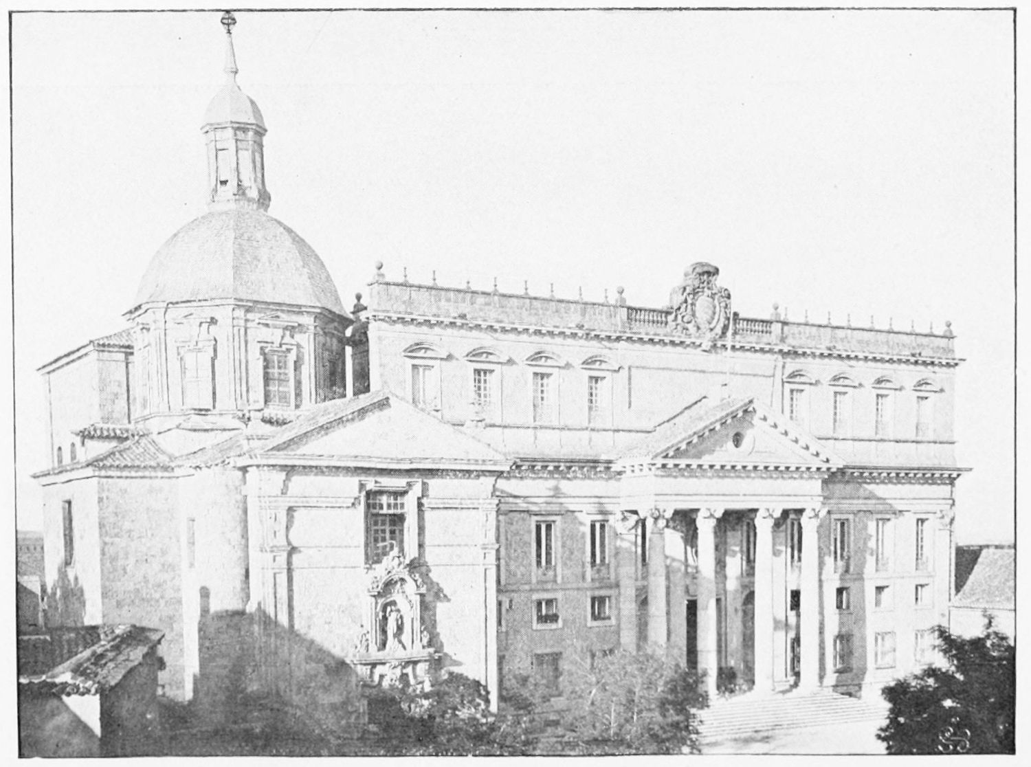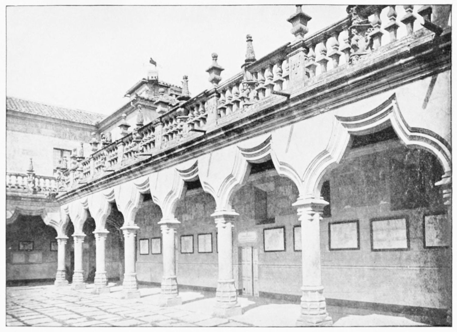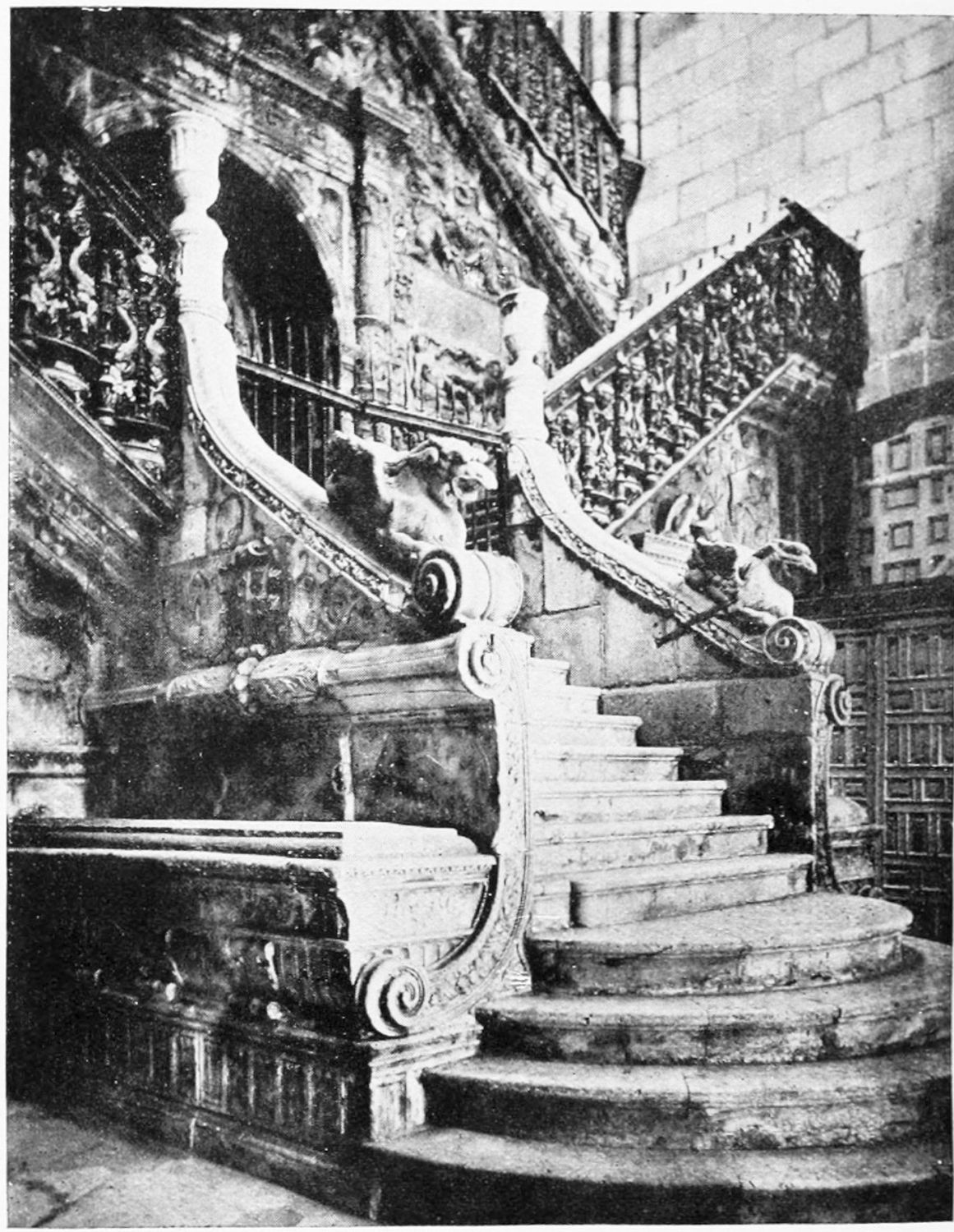 The adjoining cloister is mainly of the same period and style. The decorations are in the plateresque style, and the staircase, leading to the council chamber of the Provincial Deputation, is a daring and admirable example of Renaissance work. The library contains the beautiful Bible written in 960 by the priest Sancho, ‘whose illuminations and vignettes’ (says a native writer) ‘with their sinister figures with black faces, curious dresses, and gloomy fancies, display the artistic tendencies of that age of turmoil.’