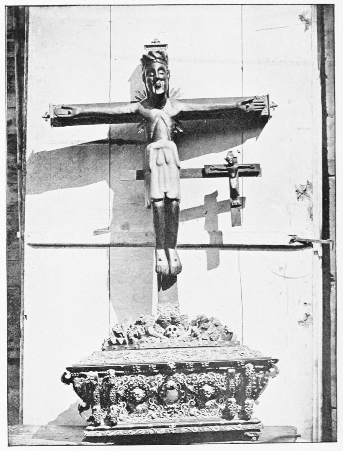 The arches of this gloomy Pantheon are decorated with curious frescoes, probably of the twelfth century. The crude drawing and tints rather add to the impressive effect of these solemn paintings. Among the subjects are the ‘Massacre of the Innocents,’ the ‘Last Supper’ (painted, as Street points out, without the least regard to the angles formed by the groining, and as if the vault were a flat surface), scenes from the Passion, and the Visions of the Apocalypse—terrible conceptions. One of the designs represents the Supreme Judge with two swords issuing from His mouth; another shows a hand, inscribed Dextra Dei. The compositions are surrounded by foliage, rich and conventional. On the altar is an interesting ivory cross, the gift of Fernando I. and Sancha, whose names are engraved upon the reverse. While the figure of Christ is rude in the extreme, the foliage and figures of the four evangelists at the back are exquisitely chiselled.{12}