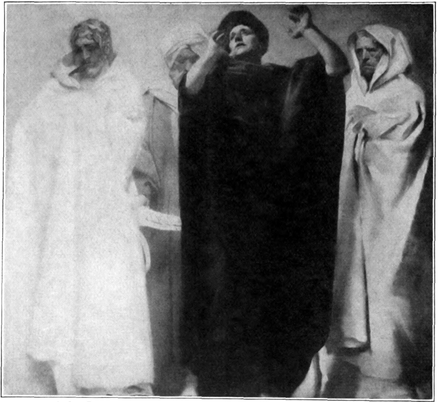 Seated in this restful gray room, she seems to be in a happy reverie of the days gone by. The simple dignity of the thoughtful figure is increased by the refinement of her surroundings. A single picture and part of the frame of another hang on the gray wall behind her. At the left we see a very dark green curtain hanging in straight folds, with its weird Japanese pattern of white flowers.
