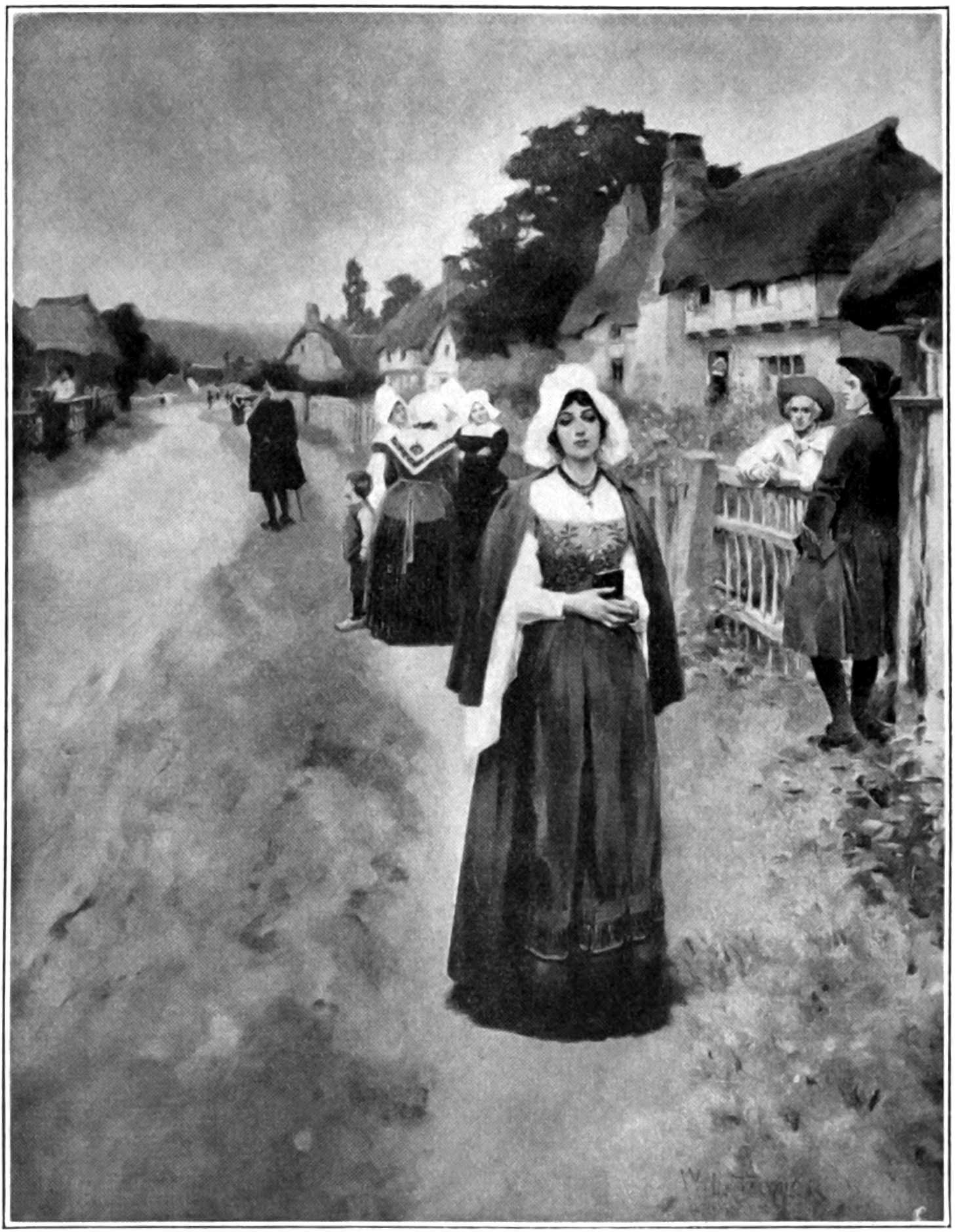 It is not difficult to determine who is the center of interest in this picture. We recognize Evangeline with her white Normandy cap, her kirtle or short jacket with its flowing sleeves, and we can even distinguish her beads. Her missal, or Roman Catholic mass book, is clasped in both hands as she passes quietly down the street, and the expression in her face is one of perfect peace and happiness.
