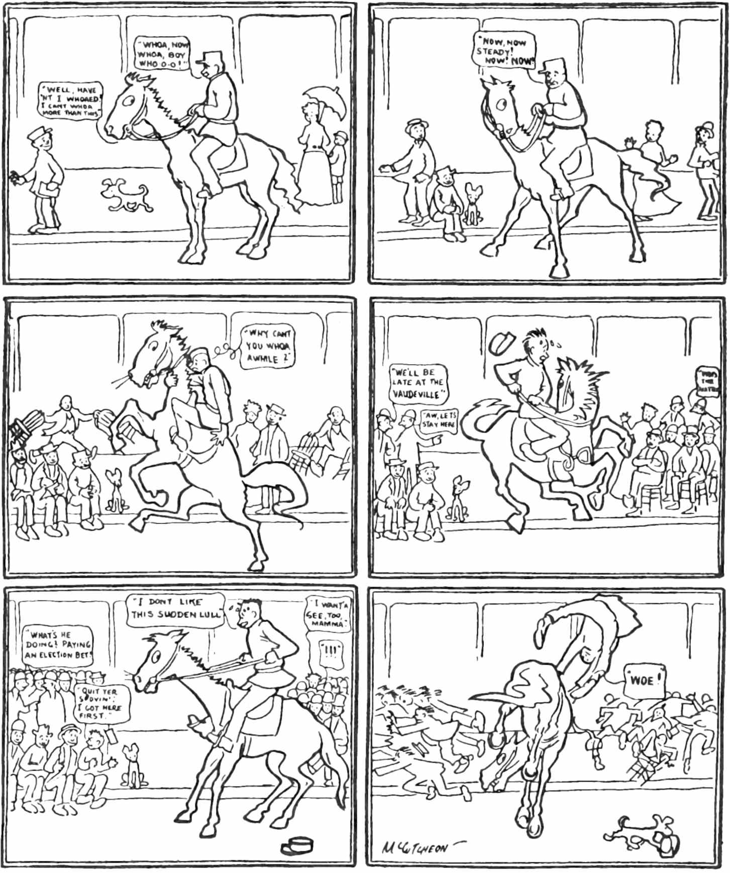 Then, too, the Sunday supplements are full of them, and we have become well acquainted with Frederick Burr Opper, creator of “Happy Hooligan,” “The Folks in Funnyville,” “Alphonse and Gaston,” “Maud, the Matchless,” “John Bull,” and others; Richard Felton Outcault, creator of “Hogan’s Alley,” “Yellow Kid,” “Buster Brown,” “Buster, Mary Jane, and Tige”; A. B. Frost, creator of “Tragedy of the Kind Hearted Man and the Ungrateful Bull Calf” and “The Spinster’s Cat That Ate Rat Poison,”; Carl Emil Schultze, known as “Bunny,” creator of “Foxy Grandpa” and “Bunny’s Blue Book,” and many others.