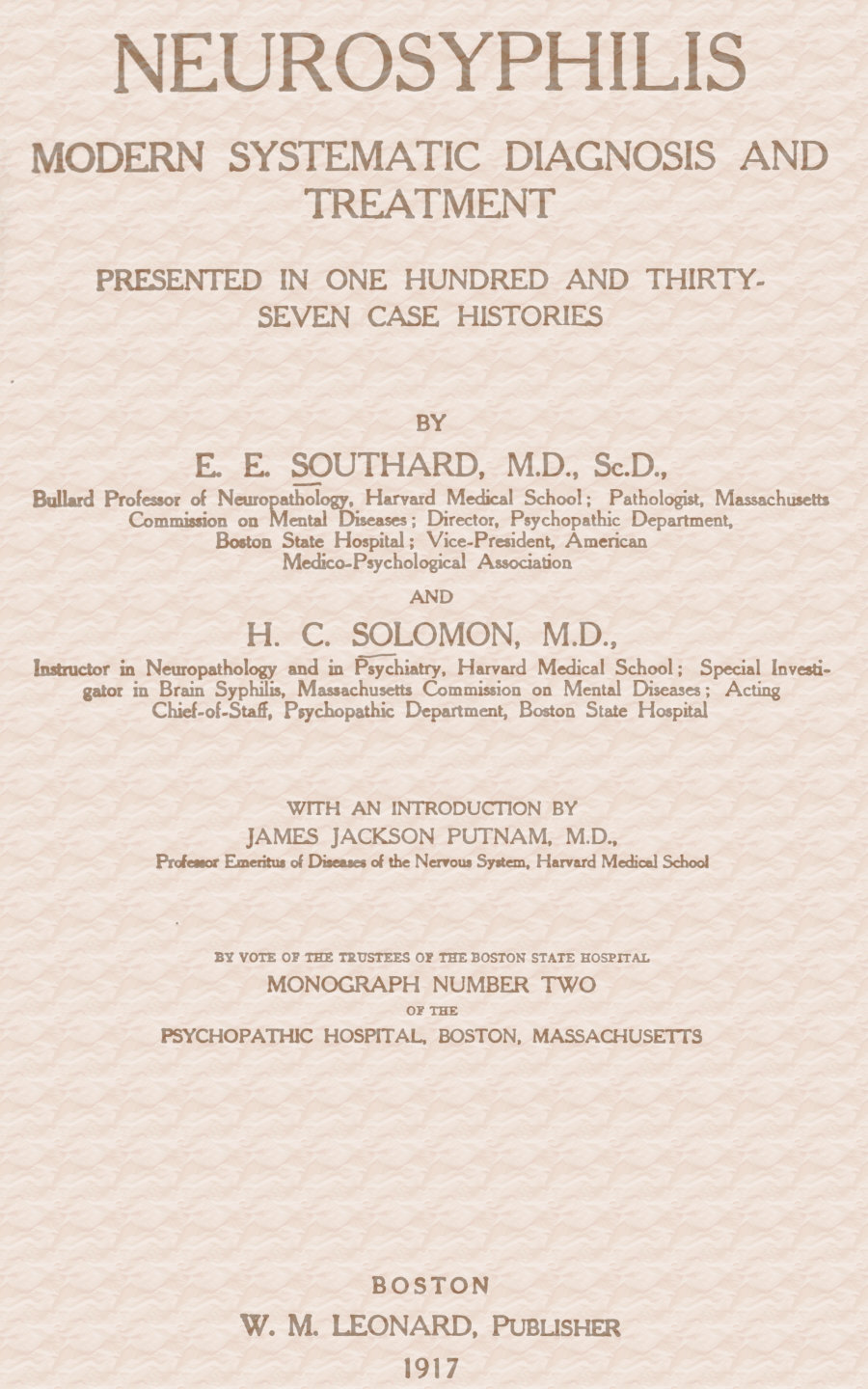 Speaking for the moment as the senior author of this book, I wish to say that, were it not for the energy, industry, and ingenuity of the junior author, Dr. H. C. Solomon, the book would not have been written. Nor, in all probability, would the systematic work of the Commonwealth on neurosyphilis and its treatment ever have been begun. I can also accord the highest praise to Mrs. Maida Herman Solomon for her social-service work in this new field.