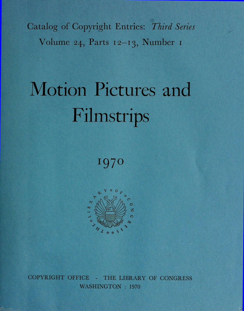 Parts 12-13 list published and unpublished motion pictures currently registered in classes L and M, and filmstrips currently registered in classes A and J. Films for which the copyright has been renewed are listed separately in the Renewal Registrations section. The motion pictures registered include feature pictures, cartoons, newsreels, industrial films, classroom films, television films, etc. Many of the recording scripts made to accompany filmstrips are registered in classes C and D and are listed in Parts 3-4: Dramas and Works prepared for Oral Delivery.