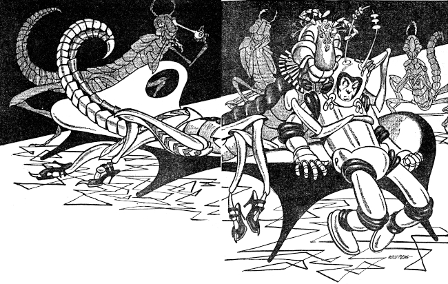 I sprayed just a tiny bit on my suit, calculated to soothe and lure but not to excite. I wanted no more cuddling with Akroida, please! Then with my pal Attaboy, I stiffened my backbone and plunged out into that poison gas they call atmosphere. I let Attaboy ferry me. He was very hazy about our return trip from Akroida's chamber, so I decided to leave him ignorant. No use to let even him know I could locomote the scorpion way. I might need to make a getaway, and surprise might be of the very essence.
