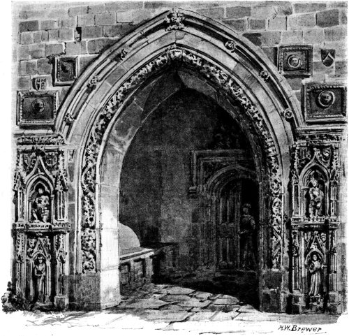 At the commencement of these papers we attempted to describe the growth of English villages and their origin as the surrounding adjuncts of the villa, or residence of the proprietor of the district, or lord of the soil. In Roman times this residence was called a villa; in Saxon and Norman times it became a castle, and after that important wave of civilisation which passed over this country in the 13th century, curtailing the power of the barons, it became “the manor house.” Now although the manor house of the 14th century was a less formidable building than the Norman castle, it was generally an important structure, and at times possessed considerable architectural beauty. Very few early manor houses are perfect now, or in any way complete, as they were nearly ruined, if not destroyed, during the “Wars of the Roses.” Sometimes, however, we may still trace fragments of them attached to modern cottages or houses. The finest fragment of the kind we know is to be seen at the little village of Arminghall, about ten miles from Norwich. A cottage or small farmhouse here possesses a doorway which is, perhaps, the finest example of domestic Gothic architecture in the country. It is improbable that it was originally intended to serve its present use as an entrance to a cottage porch, and the traditions of the place point to its having been a fragment of an ancient manor house, called by the people “The Old Hall.” Little or nothing seems to be known about it, and if it really did form a portion of some ancient mansion, with the solitary exception of this arch, everything else has disappeared. As will be seen from our sketch, it is a very elaborate work of remarkable design, and from its style there can be little doubt that it dates from the reign of Edward III. Between the mouldings which enclose the arch runs a broad band of carved foliage chiefly representing a vine, with lizards looking through the leaves. On either side of the arch are very elaborate niches in two ranges filled with statues of knights and ladies. Delicately-treated pinnacles and finials adorn these niches, and the whole work is remarkable for elegance and most finished workmanship, somewhat resembling the fragment of the hall of the bishop’s palace at Norwich. The inner doorway of the porch forms no portion of this beautiful work, as it is late Tudor, and the curious slabs over the doorway look like seventeenth century carvings. Now whether this magnificent doorway is a portion of some mansion which was completed at the same time, or whether no portion of the architectural scheme, except the doorway, was carried out, or, what is perhaps still more probable, whether after the work had been abandoned for centuries, it was again resumed, and carried out in a much plainer and less costly style, of which the inner doorway is the only existing portion, it is quite impossible to say. However the case may be, there can be no doubt that this cottage at Arminghall has the most beautiful doorway of a house in England. There is nothing whatever of interest in the cottage itself apart from its entrance.