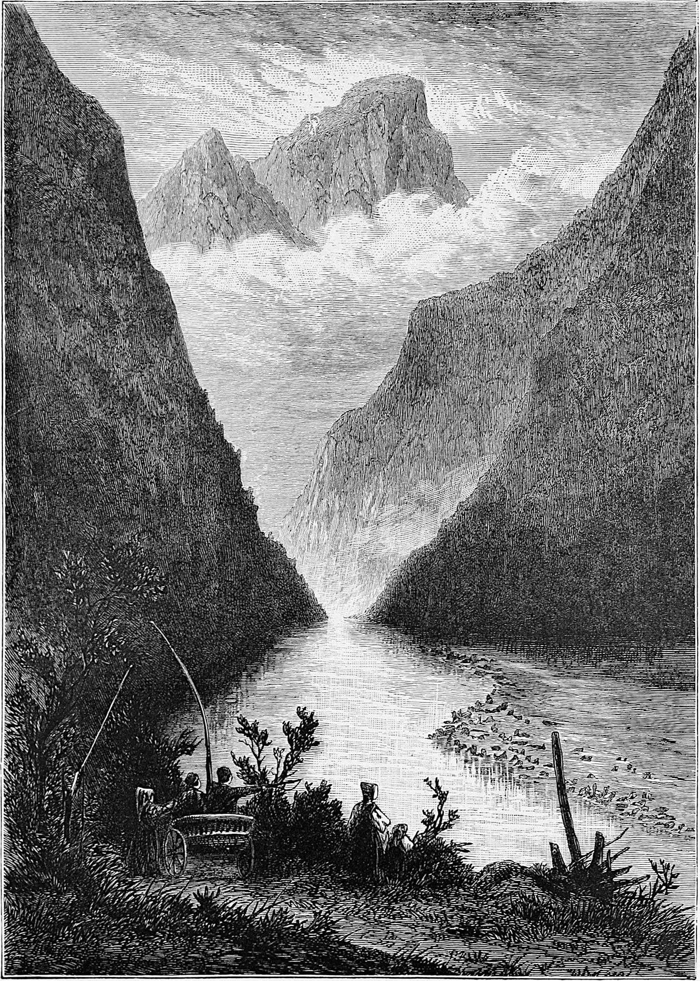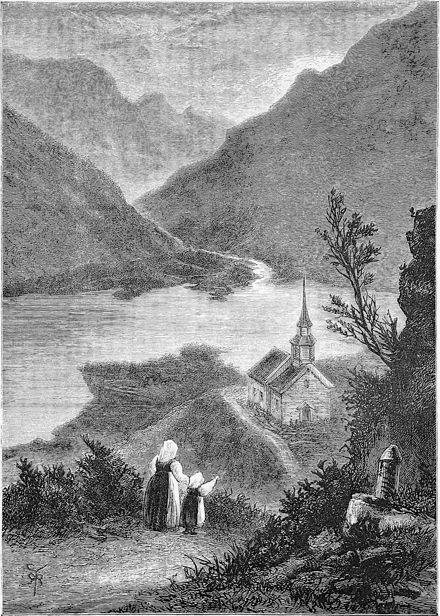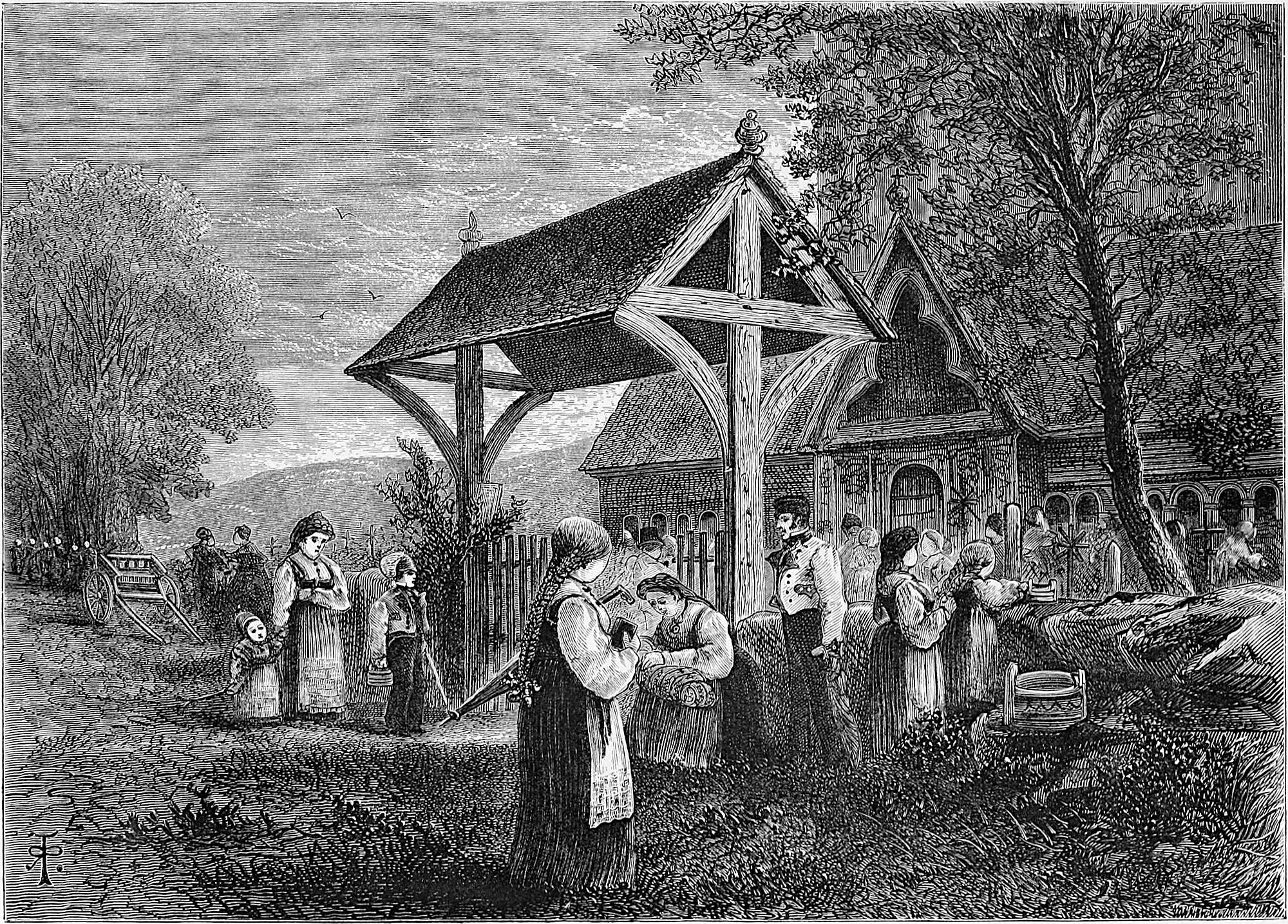 A Norwegian funeral is surrounded by an unwholesome atmosphere of intense melancholy; hope and faith seem trampled down for the moment by the weight of present grief. The Norwegians certainly do not look upon 199the arrival of the reaper who puts in the sickle as the “order of release” from the trammels of our lower state. Perhaps their intensity of feeling is a certain relief from which they rebound to a lighter burden in after-life. Their quiet, secluded life encourages this; the very sombreness of the 200country develops it; and the almost oppressive grandeur of the scenery sustains it; while the absence of birds with joyous song certainly adds to it.