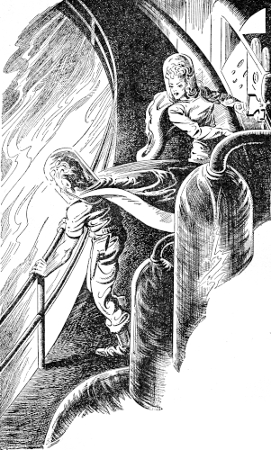 Different, because Dar Vaajo strode swiftly into view! He approached Praana who straightened up suddenly from the Magnum's panel. Vaajo was trembling with rage, but Praana faced him defiantly. For a moment no one spoke. Then Vaajo turned, facing the screen so Ketrik could see him. Anger was still on his face, but something of triumph too.