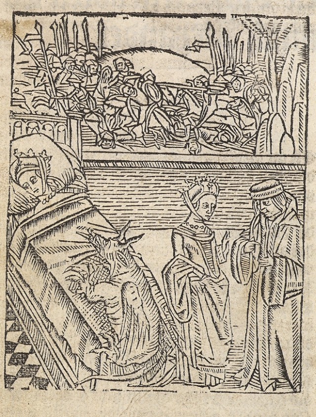 Als Neptanabus tot deser vrouwen quã eñ hi sach dat sy zeer schoone was Soe wort hi haer zeer beminnende: eñ hi gaf haer te verstaen dat sy eenen zone dragen soude die alsoe machtich wesen soude: Al waert dat Philippus haer mã haer verdriuen wilde haer zone soudese wel te rechte houden. Eñ hi seide haer dat sy dien zone aen eenen god winnen soude. Hier om wort sy zeer bescaemt eñ veruaert: eñ sy vraechde hẽ Wat god salt sijn Neptanabus antwoorde haer: segghende Het sal wesen Ammon die god vã Libra Hier om bereyde di tamelic eñ eerlick datstu waerdich moechste wesen alsulkẽ god te ontfaen. eñ du sulste gaen tot deser stat daer sal hi tot v comẽ inder gedaente van eenen drake In deser manieren so bedroech dese touenaer Olymphias eñ hi quam seluer tot haer in eens draken ghedaente. want hi conste hẽ seluen wel verscheppen Dus lach hi bi haer eñ wan aen haer den stoutẽ Alexander Des nachts dede hi dit Philippus dẽ coninc Olymphias mã in een droom te voren comen daer hi lach voor een stat Eñ Philippus die coninc ontboet een droom beduder die zeer wijs was. eñ seide hẽ: Mi docht d[at] ic in een droom sach datter een schoen god mit grauwen hare die twee clare ramshoren hadde bi m[~ij]re vrouwen Olymphias lach en sliep Eñ doe hi sinen wille mit haer gedaen hadde: soe dochte mi dat hi seyde Wijf ghi hebt vã mi ontfanghen eenen zone een wreeker Die meester antwoorde daer op Dijn vrouwe heeft eenen zone ontfangen in haer lichaem van een god Eñ om dat ghi docht dat hi graeu gehaeret was eñ ghehorent als een ram: dat beduydet dat sy dat kint ontfanghen heeft van Ammon den god van Libra, Hier om wort die coninc Philippus harde gram eñ hi liet sijn oerloghen staen eñ hi keerde haestelic te Macedonien waert Olymphias was doe zeer versaeghet ende sy onthaelde den coninc bloedelijck Eñ hi seide. Wijf ic weet wel hoet mit v [ver]gaẽ is: want dat kint datstu drages en hebstu van ghenen mã ontfãgen mer vã een god. Aldus troeste hi die vrouwe die in vresen was mit behendichedẽ. mer sijn hert was hẽ zeer tõvreden