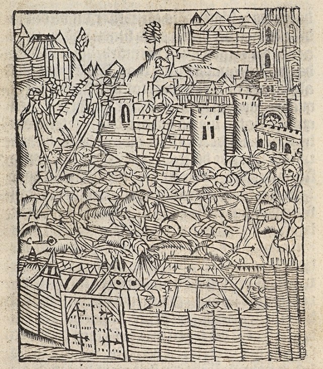 Tot deser tijt quam Philippus dẽ coninc nyeumare dat Macedonien teghens hem op steken wilde Doe vergaderde hi een groot heer eñ hi beleyde die stede Ende hem wort van opter muren sijn rechter oghe wt ghescoten Maer nochtãs en liet hi sijn oerlogen daer om niet. want waer datmen street eñ stormde daer was hij oeck mitten anderen Eñ al wortet aldus wt gescoten nochtã was hi der stat niet te felre Wãt doe die vã binnen an hẽ genade sochtẽ: soe dede hi al dat sij hẽ baden eñ hi was hẽ zeer goedertieren indẽ pays te makẽ In deser tijt warẽ oec in gryekẽ veel vaster stedẽ die wel beuest eñ bemuert waren. eñ elck wilde die stercste wesen: eñ sij droegen ouer een die een den anderẽ bij te staen in haere noot eñ dat hildẽ sij wel Desen steden lach hi aen mit behendicheden die een na die ander soe dat hijse al onder hẽ brochte. eñ al dat lant van Gryeken mede: