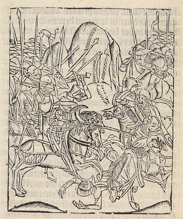 Alexander bereyde hem anderweruen tot Darius wert: eñ hij bestont eenen swaren wech Want Darius lach doen mit sijnen heer op die Tygre: eñ hi hadde daer tot s[~ij]re hulpe vier hõdert duysent mannen te voete eñ C.m: vrome ridders als Iustinus bescrijft: Doe alexander dit vernã soe badt hi sinẽ here dat sij willichlic vechten soudẽ õ des ghewins wille eñ niet wt vreesen Als Alexander tot Darius waert reedt soe voer in sijn heer mit hẽ een ridder wt Persen gewapẽt als die grieken Dese ridder stont eñ wachte een wijle eñ meende Alexander doot te slaen: mer dat benã een polette die hi op sijn hooft hadde Ter stõt soe wort dese ridder gevangen eñ men brocht hẽ voor alexãder Eñ hi vraechde hem. Wat hi hem wilde Die ridder antwoorde hẽ In enen vermeten bẽ ic hier gecomẽ Wãt had ic v doot geslagen eñ ic dã ontreden hadde so soude mi Darius sijn dochter hebbẽ gegeven. eñ een groten deel vã sinen rijcke Alexander prijsde hem dese vromicheit eñ hi hiet hẽ vry wech rijden. Als Alexander Darius naecte soe dede hi een wõderlic dinc Hij dede veel beesten vergaderẽ eñ hi dede hẽ an die hoornen eñ sterten rijsen binden. om dattet een woudt eñ een bosch soude schijnen van veere Ende om dat hi mitten rijsen die sij nae hem sleepten aenden stert die droghe mollen of sant zeer soude doen stuuen. eñ datmen also niet en soude mogen bekẽnen dat heer datter after quam Men beghan daer te vechten eñ alexander wort daer ghequetst: Ende den strijt wort soe sterck. datmen lange twijfelde wye die zeghe hebbẽ soude Maer int eynde vloet Darius eñ alle sijn heer mit hem: Eñ vas sinen heer worden verslagen lxiij:m. mans te voet eñ x:m. ridders. eñ daer waren geuangen lx:m: mãnen. Hier teghen verloes Alexander van sijnen luden hondert eñ xxx. mannen. noch hondert eñ L: Ende aldus soe verginc den strijt.