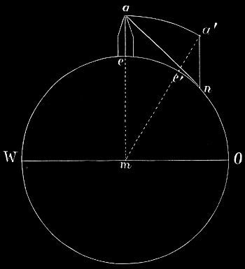 c) Kopernikus (geb. 1473 zu Thorn, gest. 1543 zu Frauenburg): Die Sonne ist der Mittelpunkt der Planetenbahnen, und diese sind Kreise, die nach außen immer weiter voneinander entfernt liegen in folgender Reihenfolge: Merkur, Venus,[90] Erde usw. Ähnliches lehrte schon um 270 v. Chr. Aristarch von Samos, fand aber keine Anerkennung.