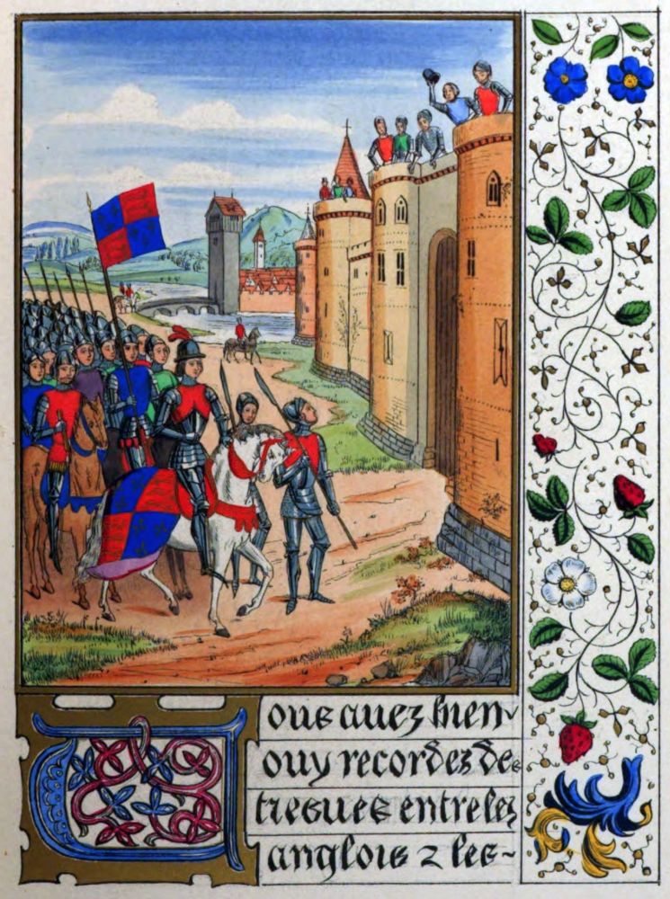 This Illumination represents a group of citizens, assembled at one of the principal gates, in the act of surrendering the city to the Queen and her party. The whole picture forms a beautiful and spirited representation of the period;—the town gate, the turreted walls, the house roofs, with the gray cathedral towering above them—the civic costumes of the citizens, the brilliant armour and rich housings of the knights and their horses, surrounding the Queen, and the characteristic treatment of the distant landscape—all tend to exhibit with wonderful faithfulness the striking features of an epoch, of which we have no other pictorial record than the Illuminations contained in the wonderful manuscripts of the period.