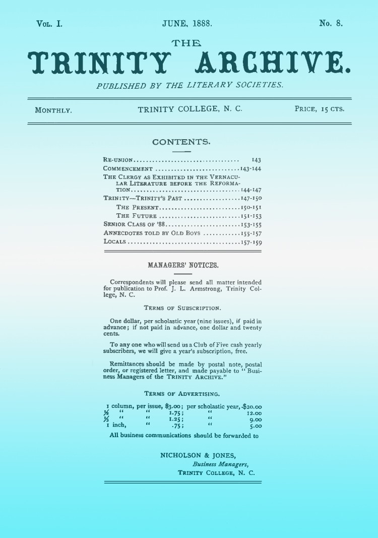 Monthly.TRINITY COLLEGE, N. C. Price, 15 cts.
