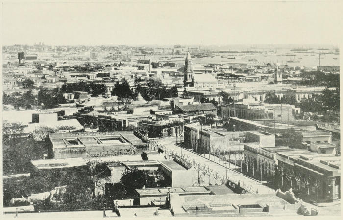 On the whole, you will see we had not so bad a time in the capital of Uruguay. Memories of our pleasant days and nights there crowd so thickly on me as I write that it is difficult to set them down, and I feel that the most I can do is to touch in the briefest way upon those that come uppermost, leaving it to the reader to imagine how our time was passed. We never seemed to tire of wandering the streets, as the avenida and the two central plazas retained an air of brightness and friendliness to a late hour, and often a military band would be playing between nine and eleven o’clock at night. Until a late hour, the town never assumed the extraordinary nightly dulness of Buenos Ayres, and very pleasant it was, night after night, to see the little family groups meet and gossip with the familiarity of a village. The Bohemian element, represented here, as elsewhere, by wide-awake hats and pendulous locks, had its habitat at the Café Giralda, at the corner of the Plaza Independencia, where most evenings the local poets—it rivals Paisley as a nest of singing birds—journalists, and “coming men” in politics, looked in for a coffee and a chat.