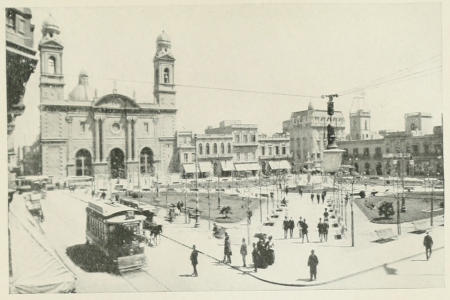 The shops, of course, do not compare favourably with those of the great metropolis further up the river, for there is not the wealth in the country to justify anything approaching the luxury and plenitude of the Buenos Ayres shopping marts. The largest establishment of the drapery kind is owned by an English firm, and there are several fine warehouses run by French and Italian firms, as well as some of considerable size under native proprietorship. But for the most part, the shops, among which jewellers’ abound, have a provincial rather than a metropolitan touch, though the newer establishments along the Avenida 18 de Julio are coming into line with the most modern ideas of shopkeeping. The habit of the tradesman living on his premises is probably one of the reasons why the early closing, so remarkable in Buenos Ayres, is not observed in Montevideo, to the consequent brightness of the streets. I remember how we used to be misled in our window gazing by the prices of the wares, soon after our arrival, as everything appeared so much cheaper than in Buenos Ayres, until we had become accustomed to the fact that the Uruguayan peso is worth exactly 62 cts. more than the Argentine, being equal to $1.02 United States money. Then we discovered that most things were somewhat more expensive!
