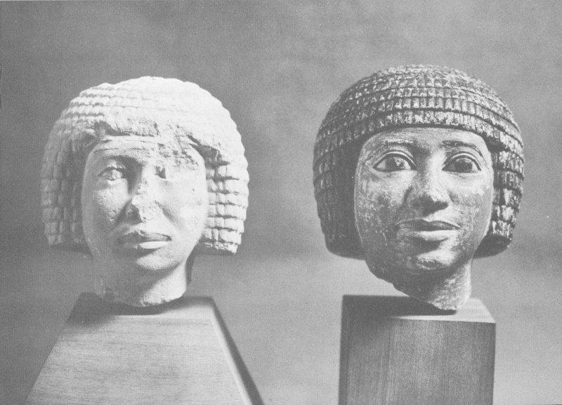 A forgery of Egyptian limestone sculpture (RIGHT) compared with a genuine example of the type (LEFT). The forgery was proved so by analyzing the binding material of the color.