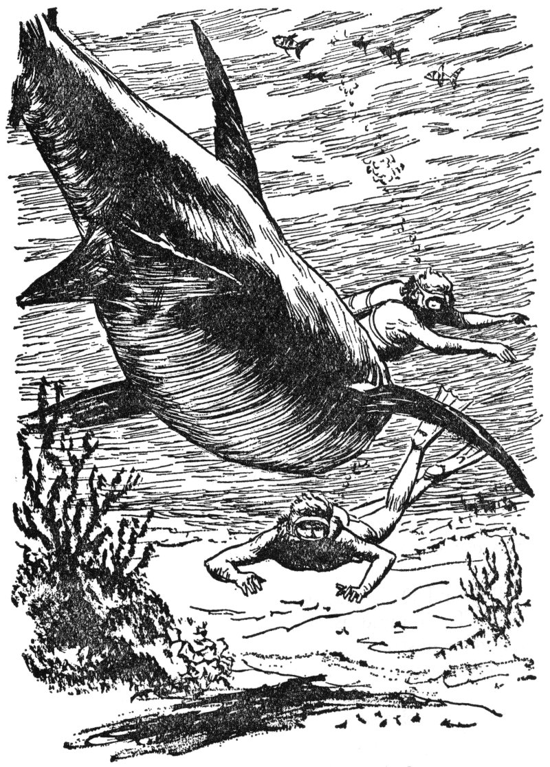 Biff slashed away at the band shells with his knife. It did no good. The giant shells continued their attack, some of them turning on Biff. There was only one thing to do. Derek was nearly helpless. Biff grabbed him. He shoved him upward with all his strength. Derek disappeared above him. Now the band shells turned their full attack on Biff. He fought them off, trying at the same time to rise. Several of them tried to fasten onto Biff’s legs. He kicked out desperately. He thrust down with his open hands and shot upward. The slower moving band shells were left behind. Biff reached the surface. He lost no time in scrambling into the boat. Uncle Charlie already had pulled Derek, bleeding, into the boat.
