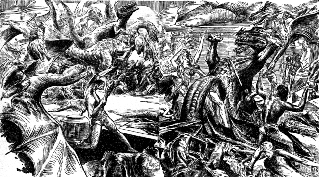 The first dragon shot in with great yellow fangs dripping with glistening venom. Toka's ax leaped and bit true to split that flat skull and send the horror crashing in wild convulsions onto the Dragon Men. It was no deterrent. More flying monsters were hurtling in with red tongues flicking and huge fangs dripping.