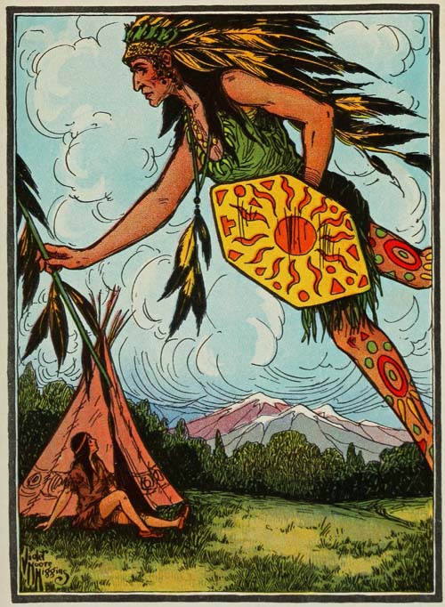 He fasted for three days in his lonely tent, sleeping at night on a bed of skins. The third day, weak from lack of food, he looked out of his doorway at sunset, and saw a splendid young brave flying down from the sky. He was clad all in green and yellow, and a tuft of green plumes nodded on his head.