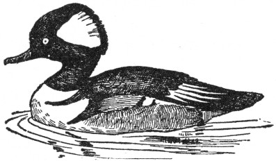Description.—Neck long; no tail-feathers; toes flat and broad, feet at rear of body; sexes similar. Adult in spring: Large, puffy head, black, with stripe and silken plumes behind eye buffy; plumage of back blackish edged with gray; secondaries white; neck, breast, and sides chestnut; belly silvery white; eyes bright pink, the pupil encircled with a white ring. Immature birds and adults in winter: Grayish black above, silvery white beneath, grayish on the throat, with white cheek-patches which nearly meet on nape. Length: 13½ inches.