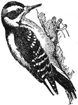 This neighborly winter bird visits the food-counter regularly and is very fond of suet. He has the habit of hiding food in the bark of trees. I once saw a Nuthatch thus hoarding sunflower seeds. At least a full hour he worked, hiding dozens of the little kernels. He was watched and followed by a pair of lazy Downy Woodpeckers who deliberately ate the seeds as fast as the Nuthatch could hide them. The Nuthatch, it appeared, has great faith in his ability to hide food where it cannot be found—so great a faith, in fact, that he did not properly guard his store.