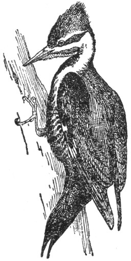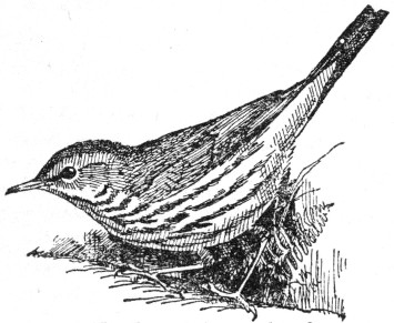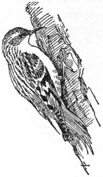 Description.—Climbs a tree-trunk like a woodpecker; smaller than an English Sparrow; bill curved like a wren’s. Plumage brown above, considerably streaked and otherwise marked with white, grayish, and darker brown; underparts grayish white; tail-feathers pointed and somewhat barred. Length: 4½ inches.