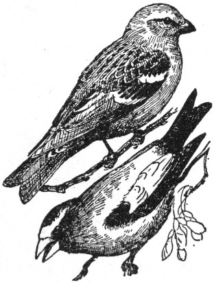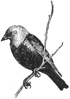 Description.—Size of English Sparrow, but with long, pointed bill, short tail, and short, strong feet. Adult male: Crown glossy blue-black; rest of upperparts blue-gray; outer tail-feathers blackish, tipped with black and white; wings with indistinct bars, and the tertials marked with black spots; sides of head and underparts white; under tail-coverts mottled with reddish brown. Female: Similar, but top of head grayish, not black. Length: 6 inches.