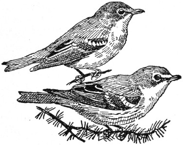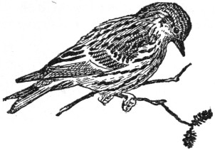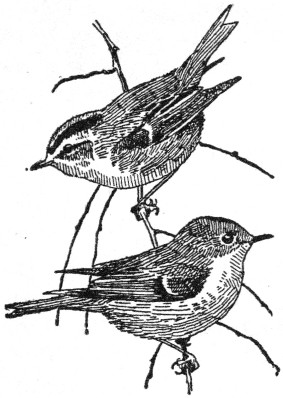 The Golden-crowned Kinglet is most noticeable as a winter bird when many of our familiar species are to the southward. It is a tiny bit of feathers, and as it perches on its slender legs it seems to be too fragile to endure the snow and cold weather. The call-note is a short lisping tsee, repeated three or four times. In spring it gives a song which starts with several wiry notes resembling one note given by the Chickadee and ending with an abbreviated series of chips. Golden-crowns like to hunt for food in coniferous trees.
