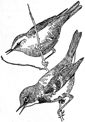 This dainty little creature is restless; his tail wags or shakes almost constantly as he pursues insects. His usual cry is a complaining new, new, whined as he hops about among the foliage. Both birds assist in covering the nest with lichens, which they gather from nearby tree-trunks, and which they bind into the structure with cobwebs so that it is firm and neat. The male may, at times, be rather noisy about the family secrets, and if we patiently watch him as he flits through the branches, he may lead us to the nest.