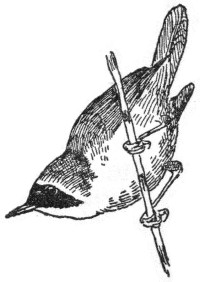 The song, which is a musical whistle, may be written wheedle, wheedle, wheedle. He has other call-notes which resemble those of the Chickadee. In his nest he gives a snake-like hiss.