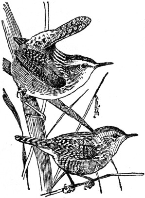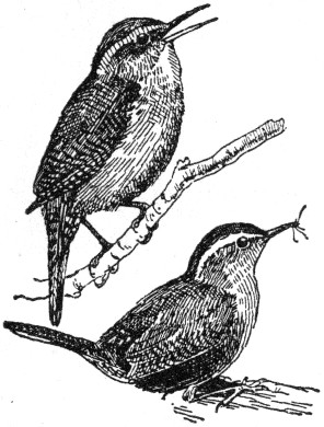 The remarkably long and rippling song of this diminutive bird will arouse interest and wonder at once. Catch sight of the mouse-like performer, and he may dive for the underbrush. The alarm-cry is a double-syllabled harsh note which resembles the throaty chup 152 of a Song Sparrow. In migration, the Winter Wren will be seen about the roots of trees or along little streams; in summer, look for him in deep hemlock forests.