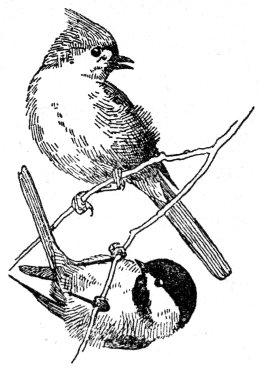 The friendly, jolly Chickadee is one of our most popular birds. He calls his name plainly, and his color-pattern is distinctive. In spring he has a plaintive love-call which sounds like phee-bee. An imitation of this whistle often brings the bird very close.