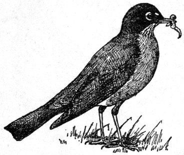 The quiet, homelike beauty of the Robin appeals to every American. As the trim bird runs about the dew-drenched lawn, he seems to impart to us his own belief in the goodness of life. He pauses to listen for an earthworm as it scratches its way along its dark tunnel; but if he does not catch the worm, he looks up brightly, runs nimbly a few feet further on, and listens again, firm in his knowledge that he will sooner or later come into his own and catch a worm perhaps even longer than the one he missed. The spotted breasts of the young bespeak kinship with the thrushes.